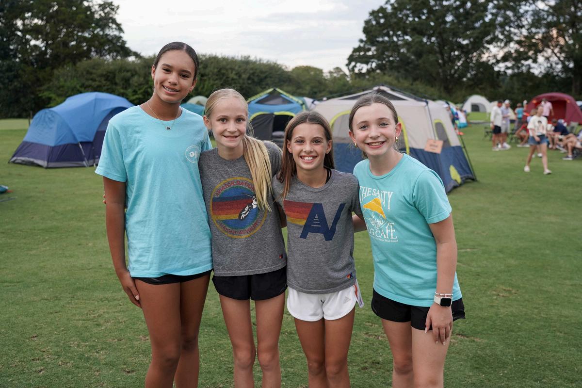 MiddleRight:OliviaBurrell,AubreyAgnewandherfriendEmerson,andCatherine RaffertystoppedforaphotoaftersettinguptheirtentsatFamilyCampout