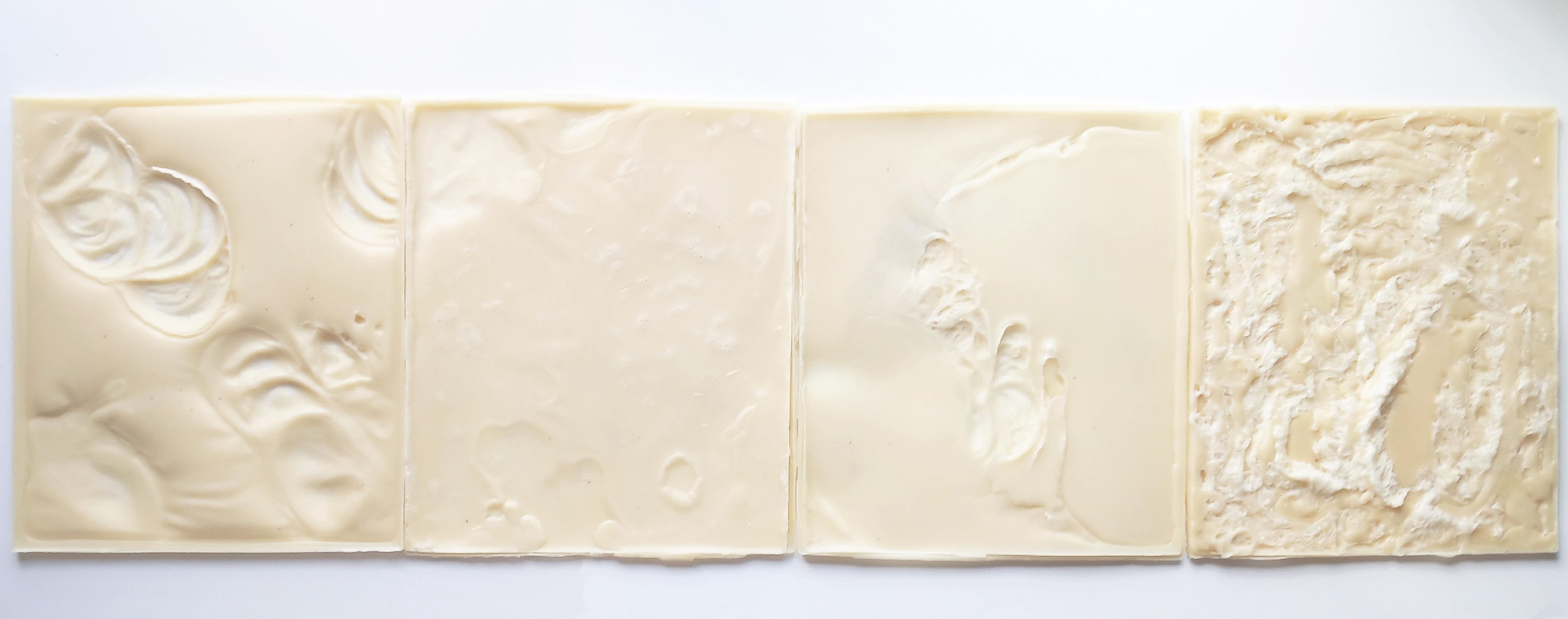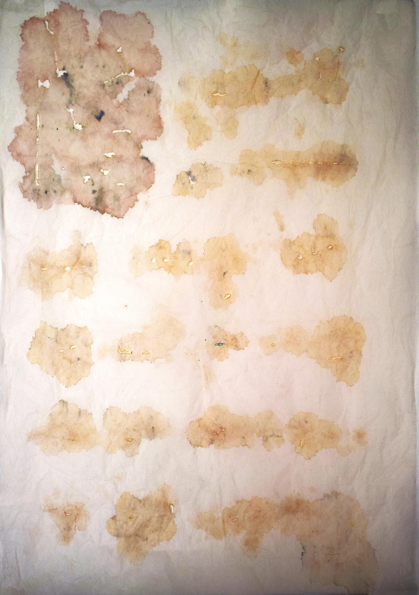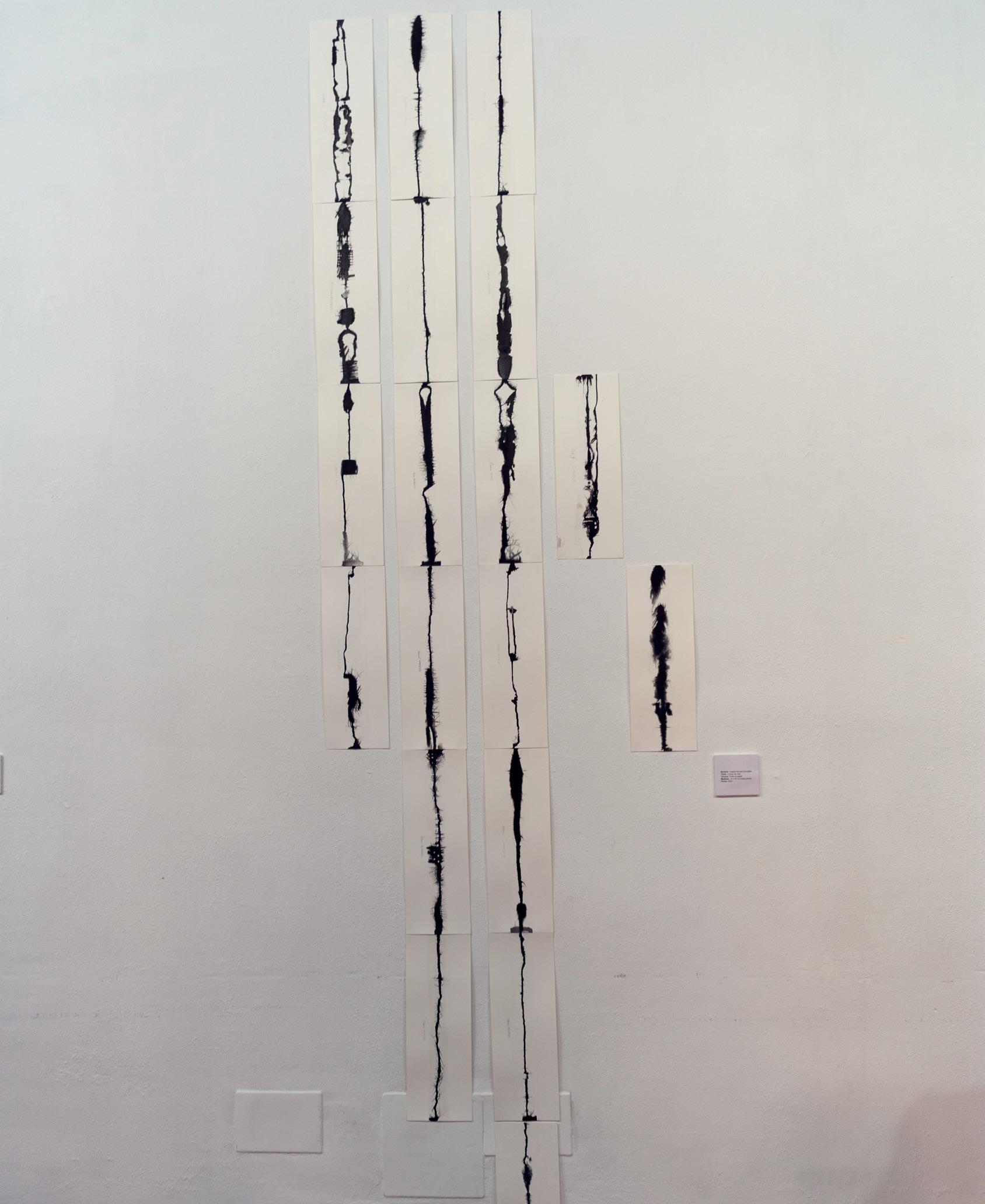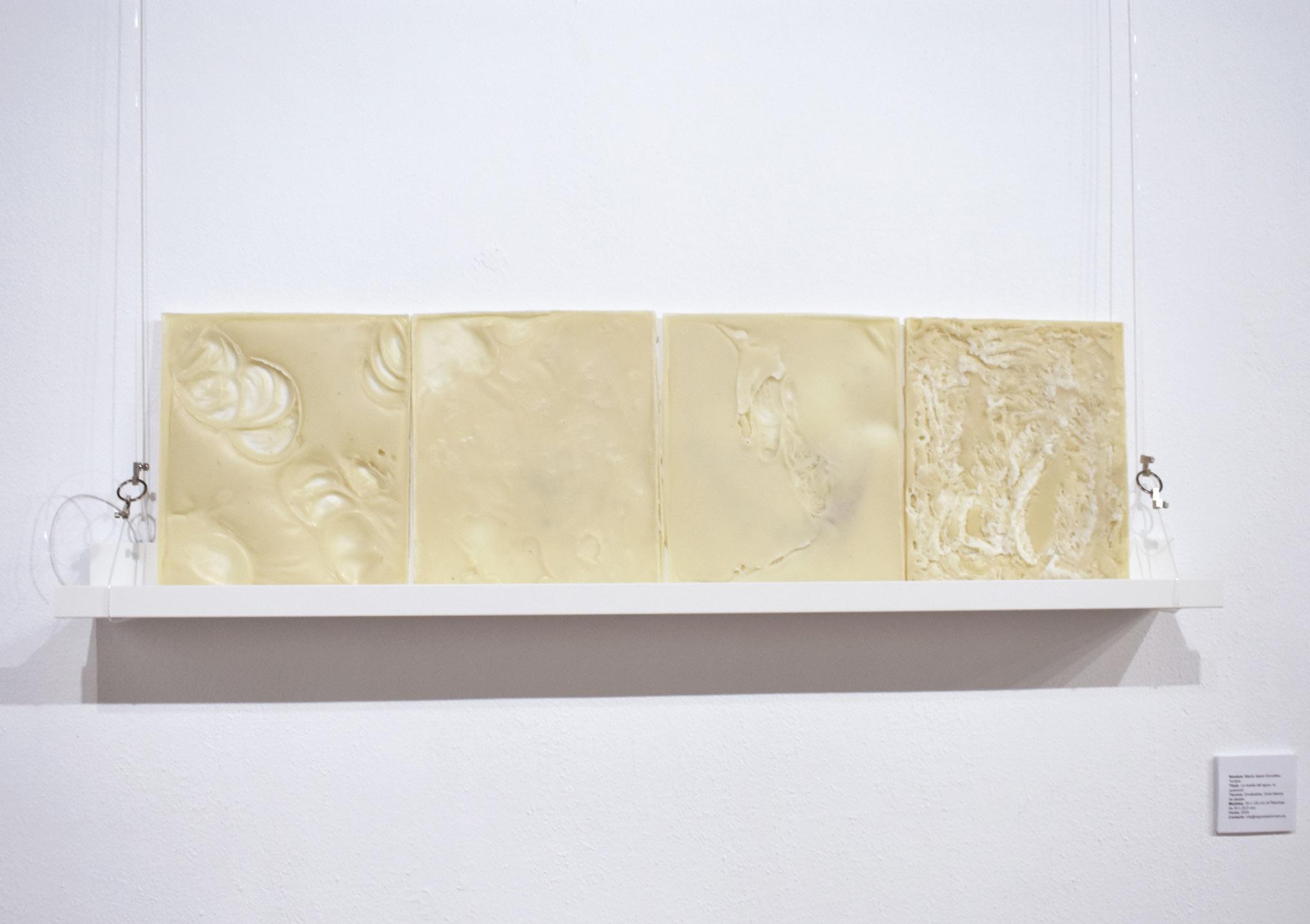Para esta propuesta, se toma como referencia a Theodor Schwenk que en El caos sensible (2009) analiza el agua, su comportamiento y las formas que provoca sobre la tierra. Las piezas presentadas se realizan mediante la técnica de encáustica y se experimenta la forma y la huella que la fuerza del agua puede provocar. El agua se vierte sobre cera de abejas blanca diluída y fija su forma e impronta en la cera. En estas planchas no hay color, se aprecia la superficie y textura que el agua define en un intento de mostrar su huella y ausencia.