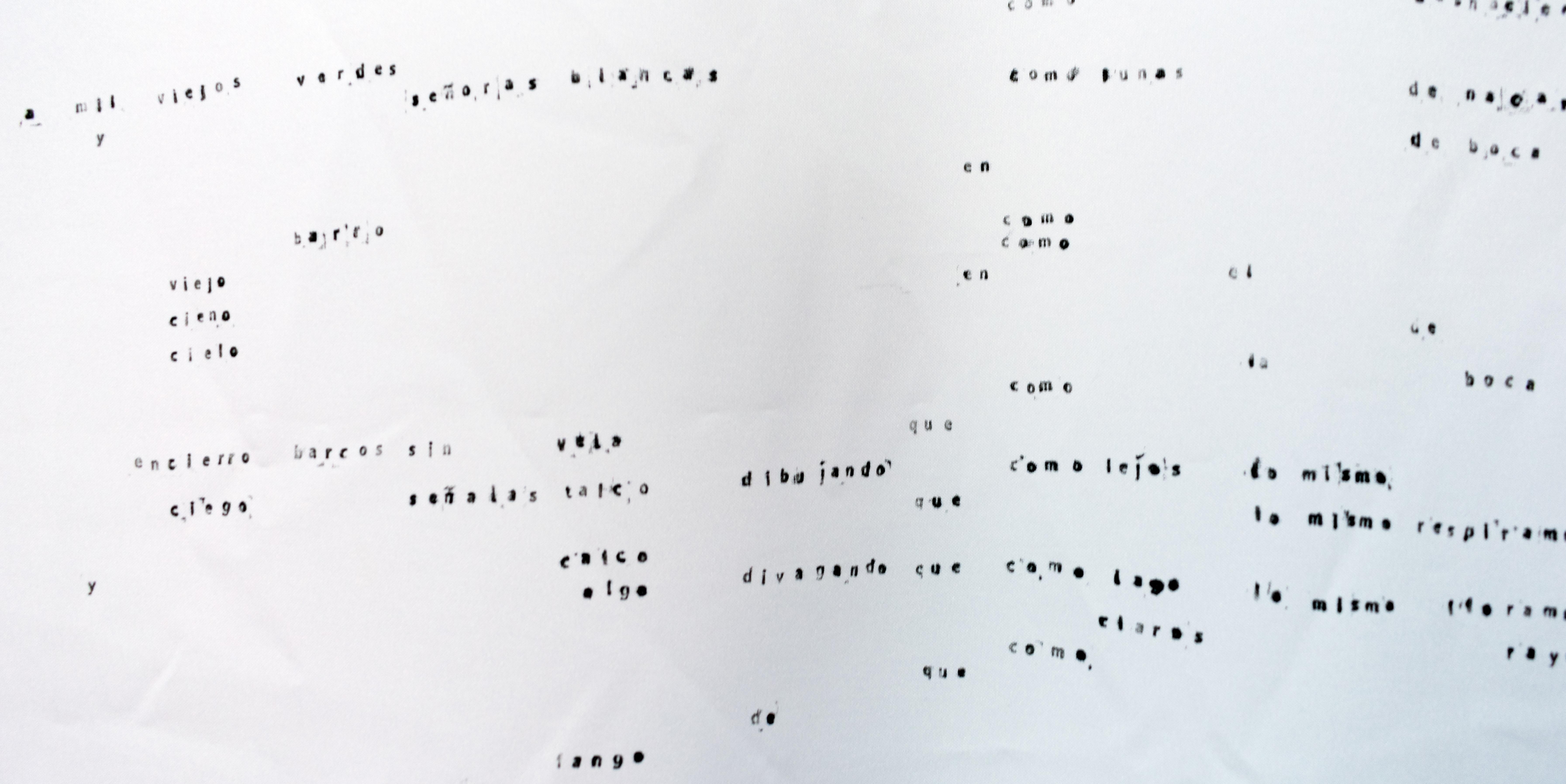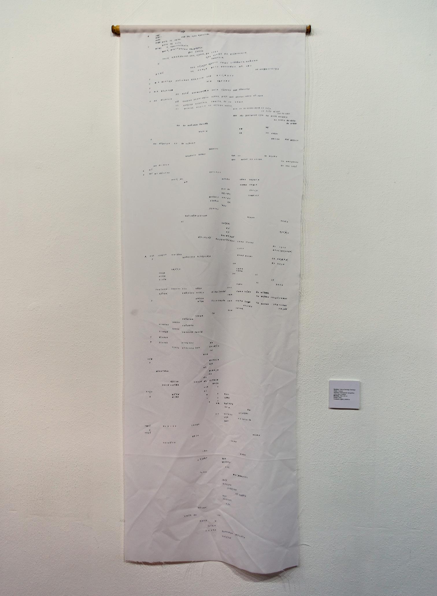 Sudario es una tela blanca que recoge la huella de un enfrentamiento con el propio pensamiento pesado que precisa su ordenación visual y sonora durante el proceso, traduciéndose gráficamente en una forma abstracta que genera un ritmo porque se crea en un pulso. En una acción automática que es metodología para que la escritura, en este caso tipográfica, sea un medio para materializar el pensamiento y un modo de investigar las posibilidades poéticas. Es un canto además de un cuento y también es un dibujo además de una descripción o narrativa. Es una oración que refleja el proceso en sí, el archivo de la propia creación. Tomando distancia, es un rastro minucioso que deja de parecerlo para definirse en el acercamiento. Por lo tanto la obra invita y aclama la necesidad de una contemplación pausada y de una lectura múltiple e interpretada.