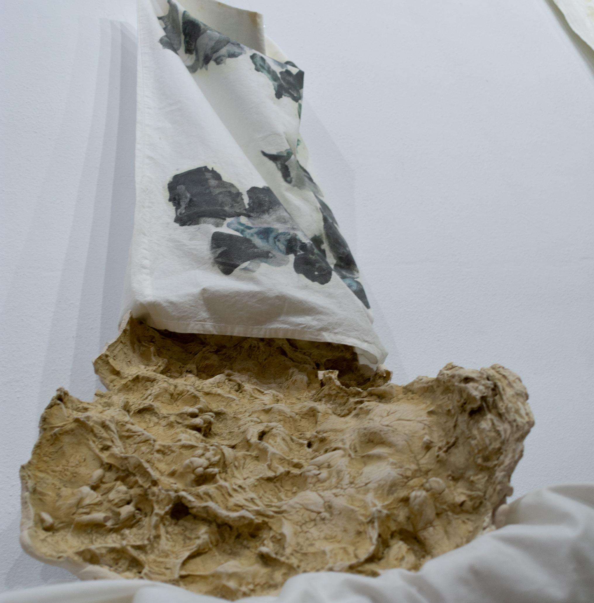Instalación formada por molde de escayola a partir de ‘almohada’ de arcilla, funda de almohada con transferencias y sonido.