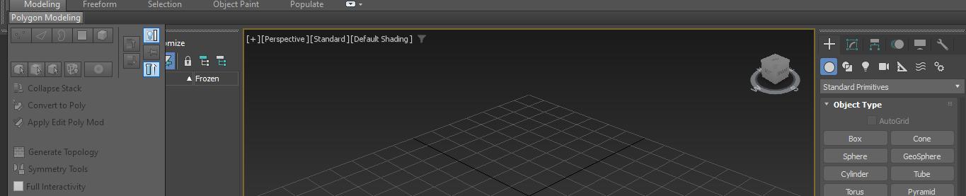 Este menú, se encuentra debajo del menú de herramientas anterior, tan solo vemos un pequeño menú en la parte izquierda del programa. Para poder activarlo, es necesario convertir el objeto que haya creado en escena en Editable Poly. Se puede hacer, presionando clic derecho sobre el objeto, y en la última función del menú, desplegar y después elegir Convertir en Editable Poly. Una vez que se haya convertido, se podrá ver que el menú que antes solo tenía pocas opciones, se ha expandido creando nuevas opciones. Esto se divide por categorías. Een la parte derecha del programa, encontramos un menú vertical que tiene las mismas características que el horizontal. Podemos elegir el que nos funcione mejor.