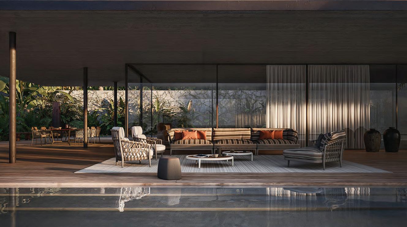 - Piano terra: ospita una luminosa zona giorno open space, caratterizzata da grandi vetrate che offrono una vista incantevole sulla piscina e sul paesaggio circostante. Completano il piano un comodo bagno di servizio e una camera da letto con bagno privato. Gli spazi esterni includono terrazzi e portici, perfetti per vivere l’outdoor in totale relax.