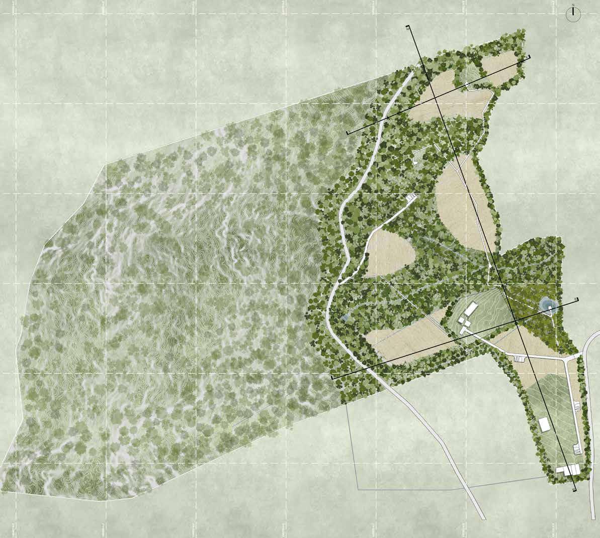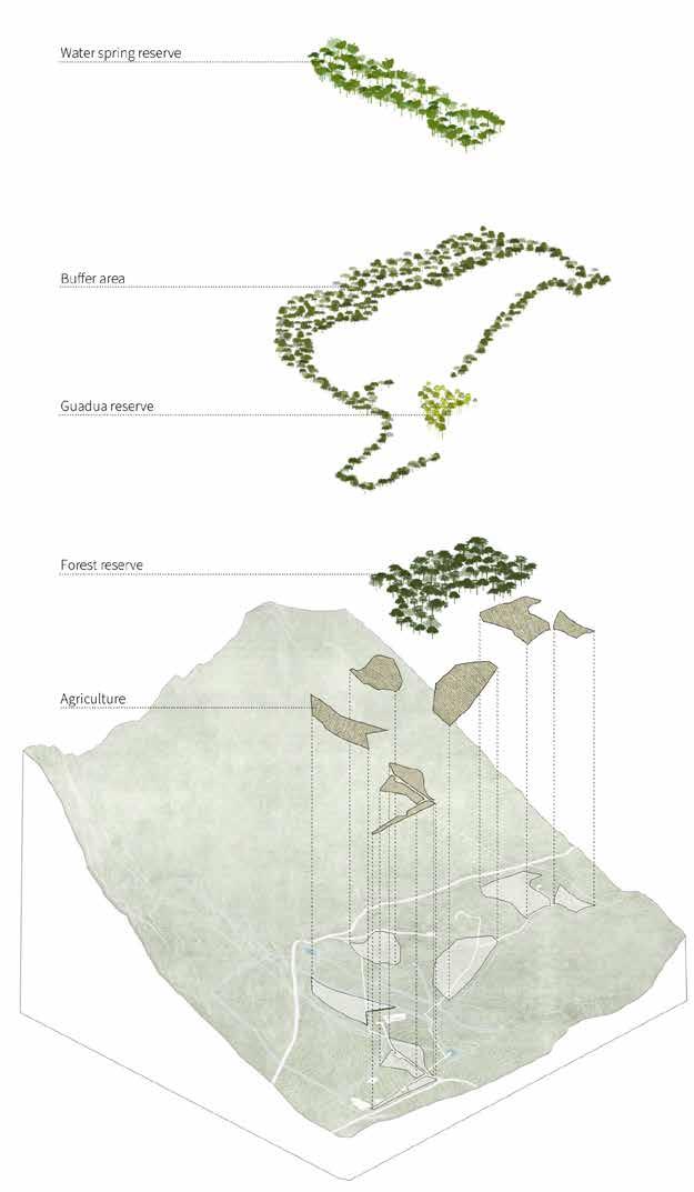 Una zona de amortiguación de 30 metros a cada lado del arroyo define las áreas destinadas a la agricultura, la recreación y la vivienda. Además, se crea una barrera de protección ambiental alrededor de la parcela para aislar los espacios interiores de las carreteras y parcelas adyacentes, fomentando un sentido de tranquilidad dentro del proyecto.