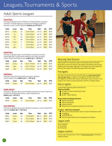 Teams play an eight game regular season followed by a postseason tournament. Tuesday league plays a six game season followed by a post season tournament. Location: Fountain View Recreation Center Deadline: Jan 4 — RTD: Dec 21