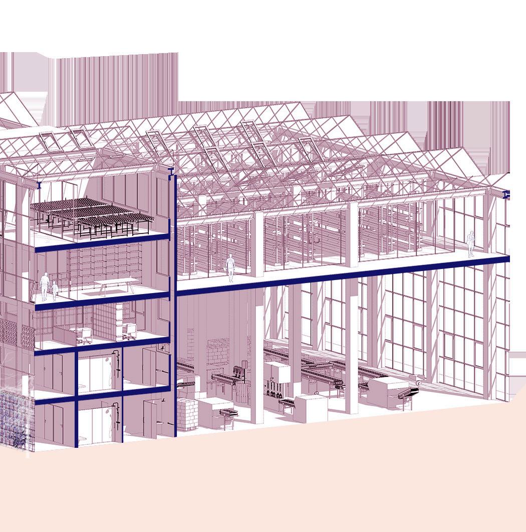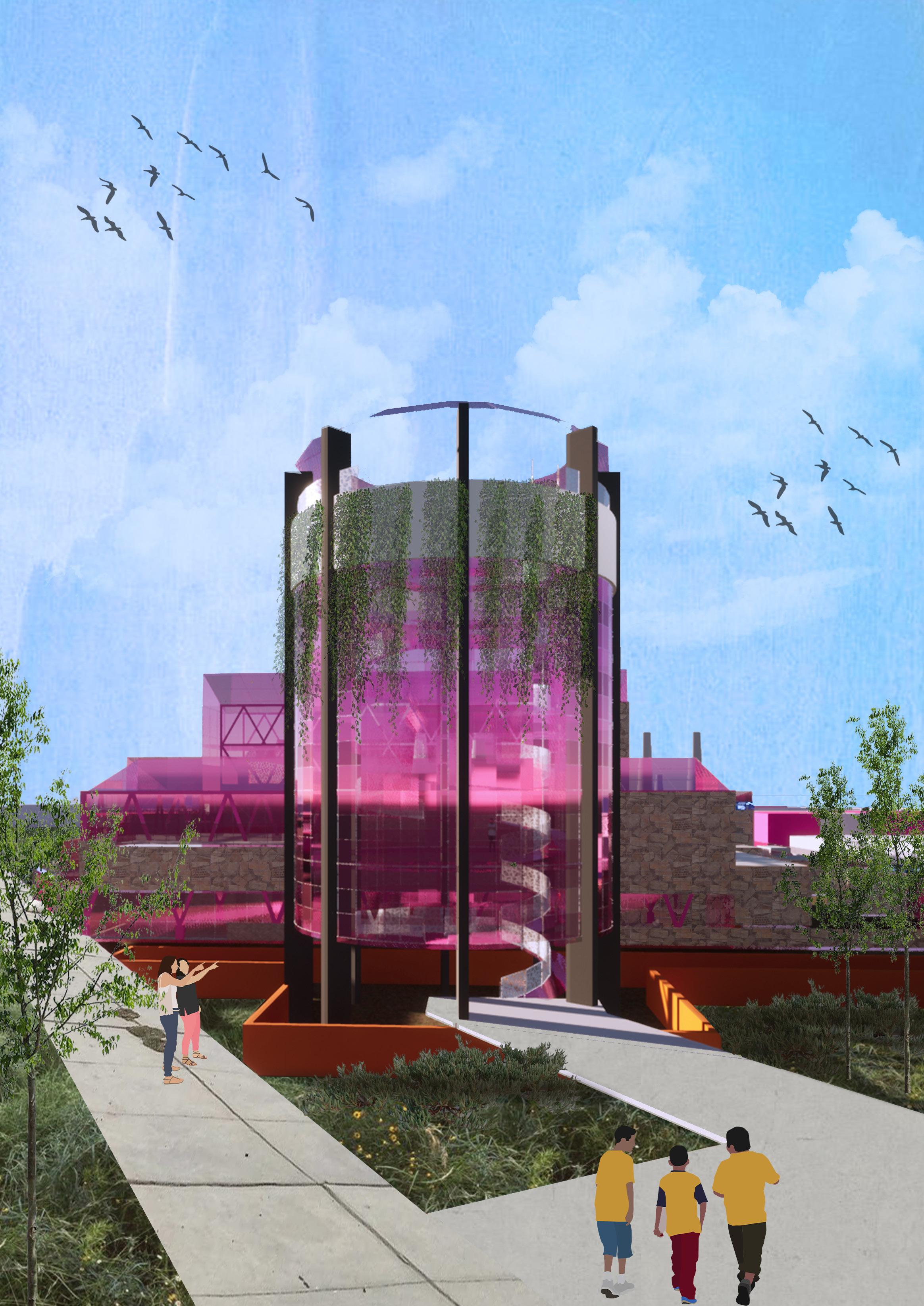 El edificio industrial alimentario abarca el empaquetado de hortalizas, frutas y verduras provenientes de cultivos hidropónicos que se cosechan en el mismo edificio, así como la producción de jugos y mermeladas. En la materialidad constructiva, se priorizó la reutilización de ladrillos encontrados en el terreno, los cuales fueron empleados en la edificación de un muro de gaviones donde se han colocado plantas enredaderas. Asimismo, el proyecto tiene como objetivo principal educar a la población, permitiéndole observar todo el proceso de producción en acción.