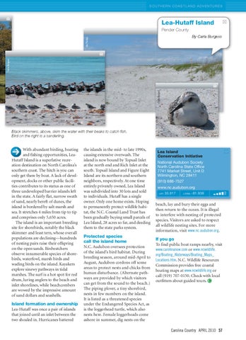 With abundant birding, boating W aand fishing opportunities, LeaHutaff H taaff Island is a superlative recreHu ation destination on North Carolina’s southern coast. The hitch is you can only get there by boat. A lack of development, docks or other public facilities contributes to its status as one of three undeveloped barrier islands left in the state. A fairly flat, narrow swath of sand, nearly bereft of dunes, the island is bordered by salt marsh and sea. It stretches 4 miles from tip to tip and comprises only 5,650 acres. The island is an important breeding site for shorebirds, notably the black skimmer and least tern, whose overall populations are declining—hundreds of nesting pairs raise their offspring on the open sands. Birdwatchers observe innumerable species of shorebirds, waterfowl, marsh birds and wading birds on the island. Kayakers explore sinewy pathways in tidal marshes. The surf is a hot spot for red drum, luring anglers to the beach and inlet shorelines, while beachcombers are wowed by the impressive amount of sand dollars and seashells. Island formation and ownership Lea-Hutaff was once a pair of islands that joined until an inlet between the two shoaled in. Hurricanes battered