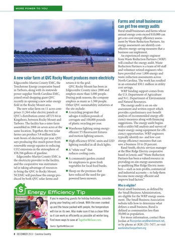 return it to the grid. QVC Rocky Mount has been in Edgecombe County since 2000 and employs more than 1,000 people. During peak seasons, the company employs as many as 1,500 people. Other QVC sustainability initiatives at the site include: ■■ A recycling program that salvages 4 million pounds of corrugate and 100,000 pounds of plastic recycling per year. ■■ Warehouse lighting using energy-