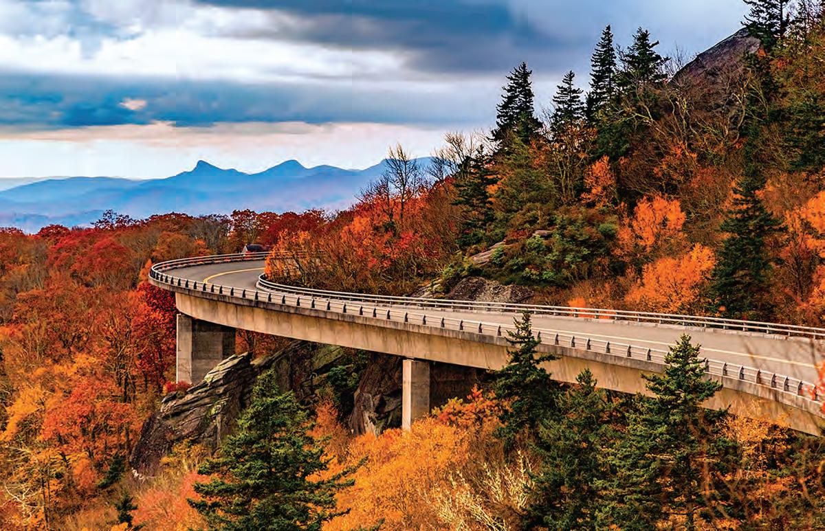 A fall view of the Linn Cove Viaduct Bridge, which hugs Grandfather Mountain at milepost 304 on the Blue Ridge Parkway.