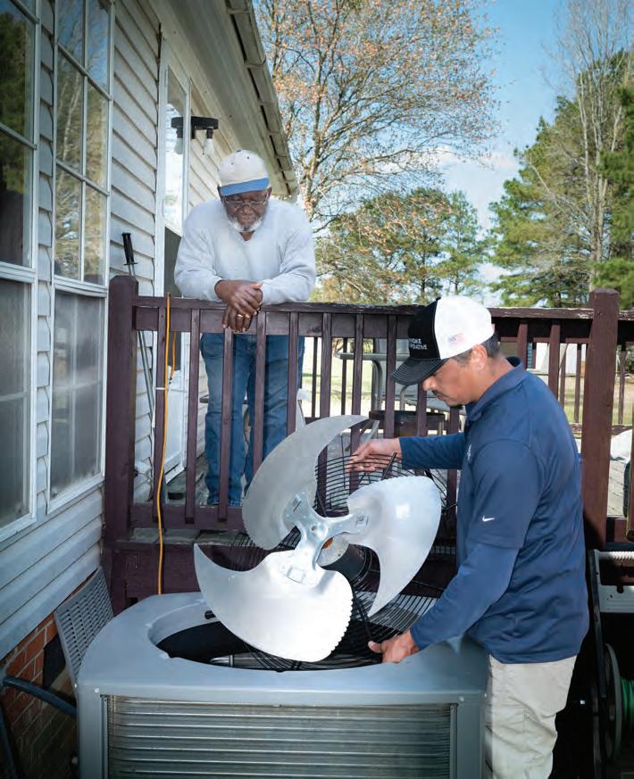 Roanoke Cooperative employees Basil Williams and Shawn Dickerson (standing, left to right) with members Joe and Jacqueline Long (seated, left to right) who are enjoying a new HVAC heat pump system installed through an energy efficiency program. Learn more about a similar statewide initiative on page 6. Photo by Randy Berger Photography.