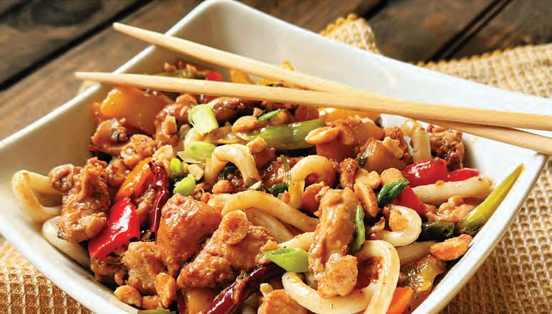 Heat 2 tablespoons of oil in a wok or large skillet over medium-high heat. Cook chicken in batches until just done, adding more oil as needed. Discard all but 2 tablespoons of oil and deglaze with water. Add garlic, ginger and chiles; stir-fry 1 minute. Add bell pepper and cook 1–2 minutes. Add hot sauce, chicken and sauce. Remove from heat and stir in scallions. Garnish with peanuts. Serve hot with noodles or rice.