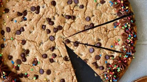 Line a 14" round metal pizza pan with parchment paper and place the dough ball in the middle of the pan. Pat the dough flat and use a rolling pin to flatten the dough into a circle. The cookie dough should be about 3/4" from the edge of the pan to allow for expansion during cooking.