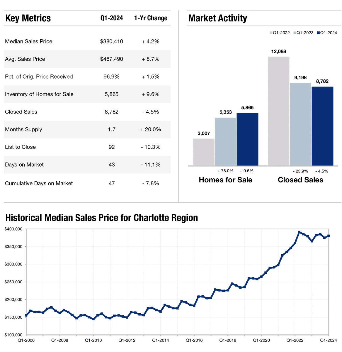 The Median Sales Price in Q1 2024 for a single family home in Charlotte was $380,410 for a year over year increase of 4.2%