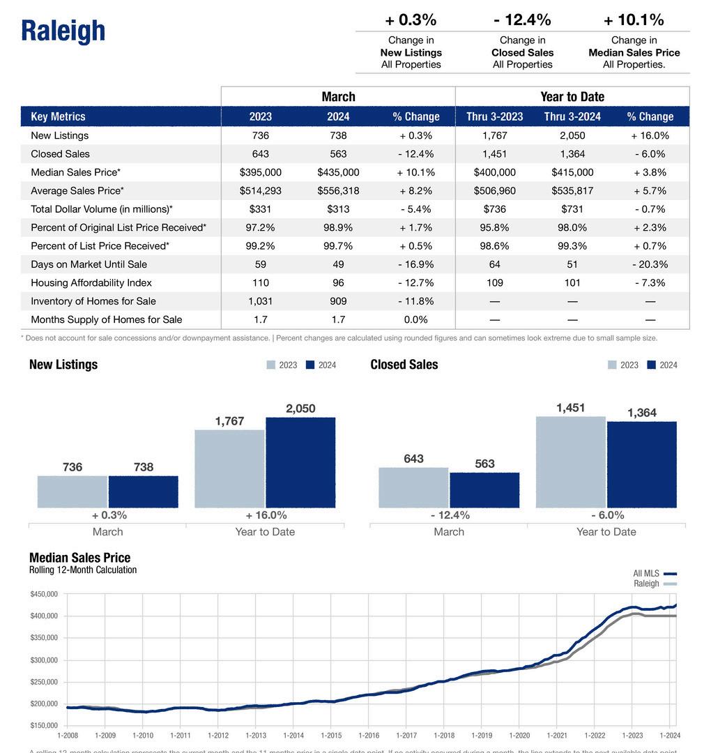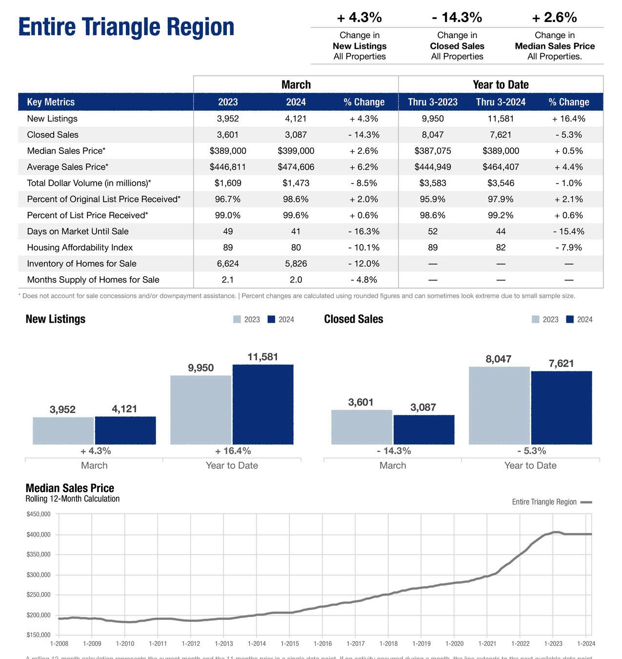 Triangle Area real estate markets remain active, with Durham and Wake County areas showing particular demand That's still positive news for sellers, for now For buyers, reduced inventory and level days on market will add more balance to this highly competitive market. Sellers will be happy to see Average Sales Prices increased in March by more than 5.2% on 2023's figures.