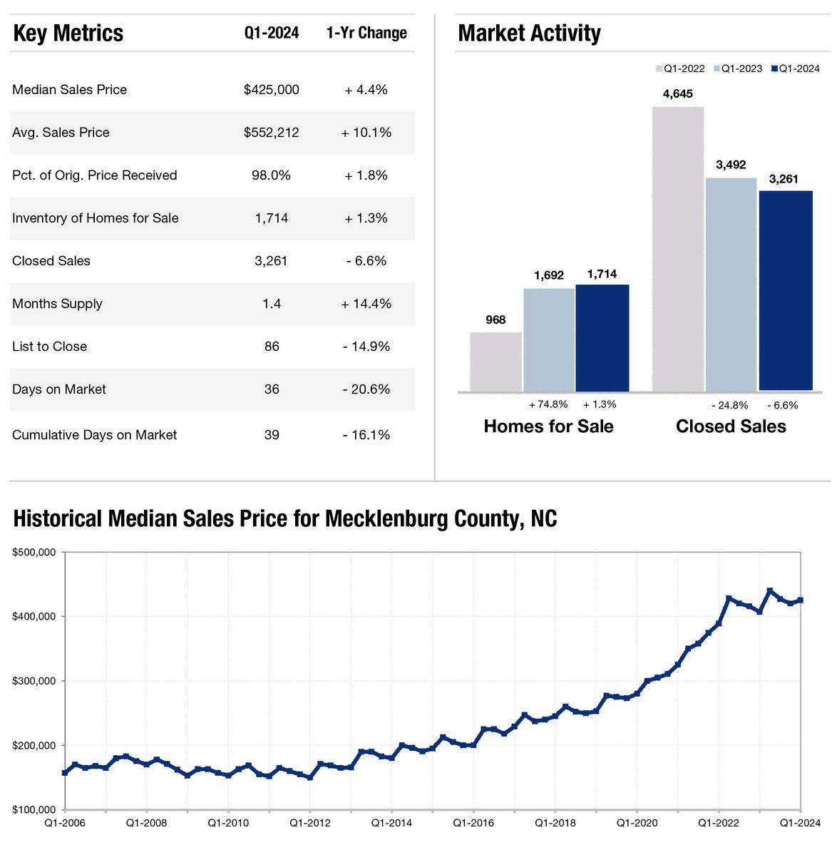 The Median Sales Price in Q1 2024 for a single family home in Mecklenburg County was $425,000 for a year over year increase of 4.4%