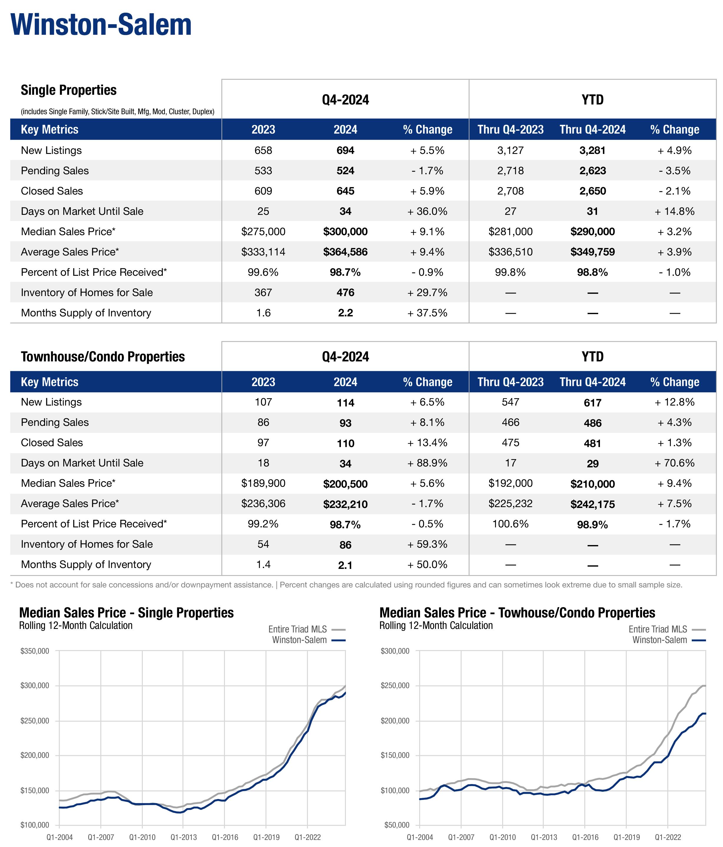 In Q4 of 2024, the Median Sales Price in Winston-Salem, NC was $300,000, trending up year-over-year by 9.1%. This laid-back city poised for continued growth is located in Forsyth County in the north-central part of North Carolina. The metro area lies along the Carolina Core in the heart of North Carolina, a 120+ mile stretch running between Winston-Salem, Fayetteville, Greensboro, & High Point. The Triad's continued big draw? Affordability!