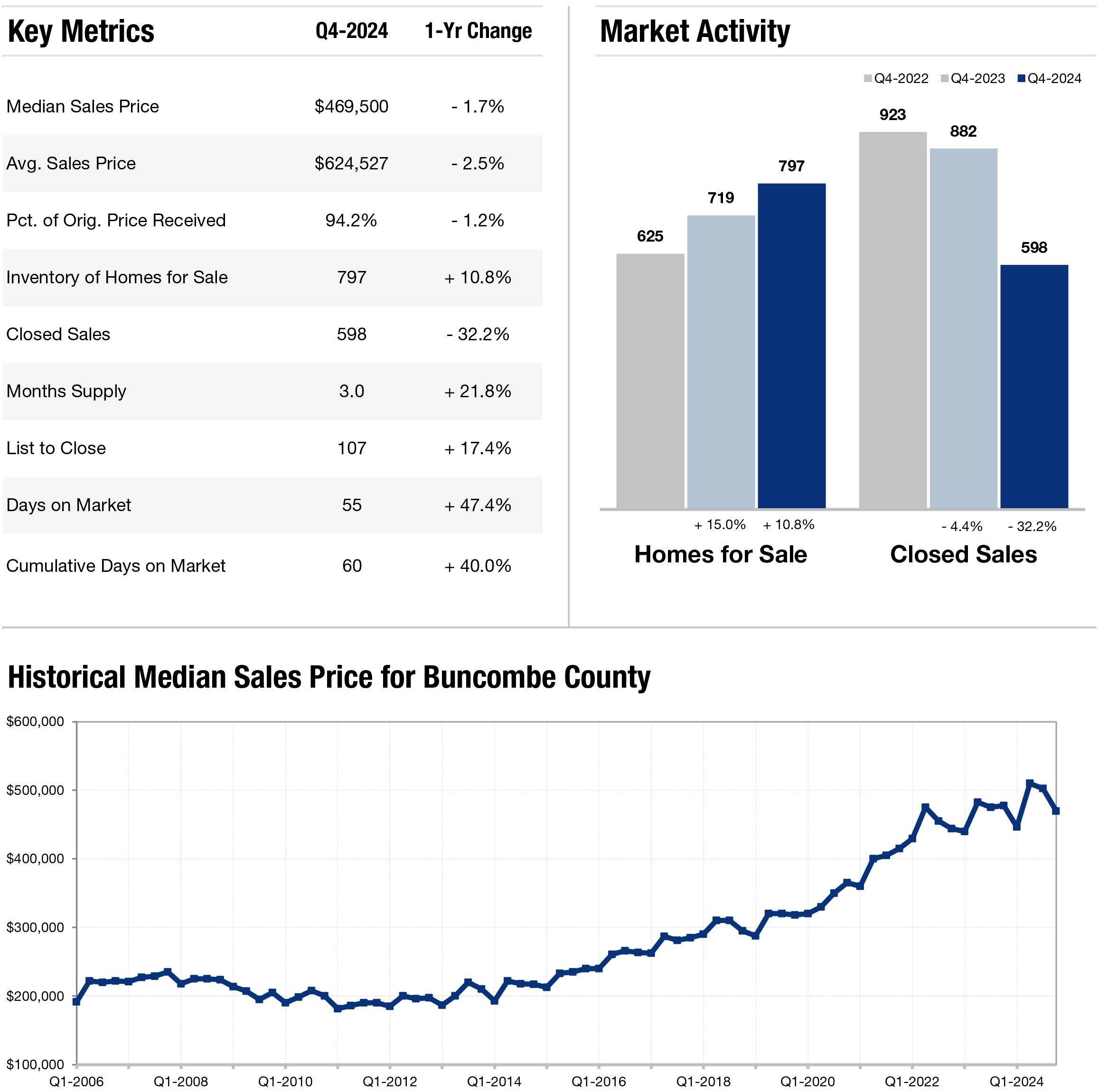 Asheville barely moved the meter on Average and Median Sales Price increases, while Month's Supply rose a considerable 24 9% Not surprisingly, Asheville’s Closed Sales have dropped more than 19% on Q4 2023 figures Expect prices to stabilize through a recovery-focused 2025 and watch for an improvement on Days on the Market