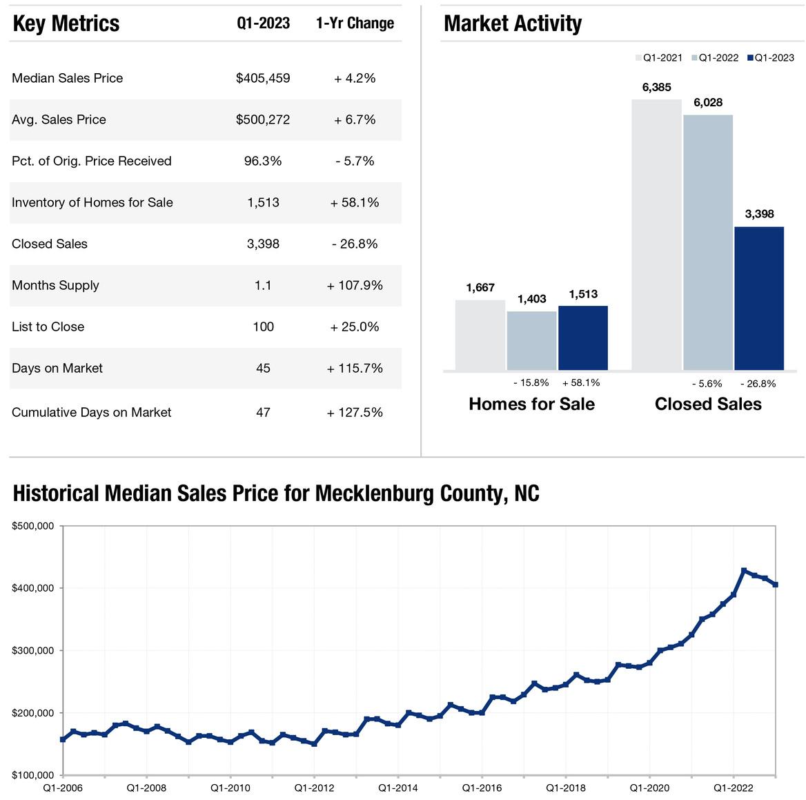 The Median Sales Price in Q1, 2023 for a single family home in Mecklenburg County was $405,459 for a year over year increase of 4.2%