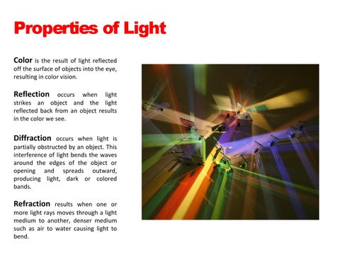 Properties of Light Color is the result of light reflected off the surface of objects into the eye, resulting in color vision.