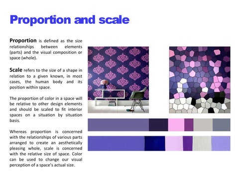 relation to a given known, in most cases, the human body and its position within space. The proportion of color in a space will be relative to other design elements and should be scaled to fit interior spaces on a situation by situation basis. Whereas proportion is concerned with the relationships of various parts arranged to create an aesthetically pleasing whole, scale is concerned with the relative size of space. Color can be used to change our visual perception of a space’s actual size.