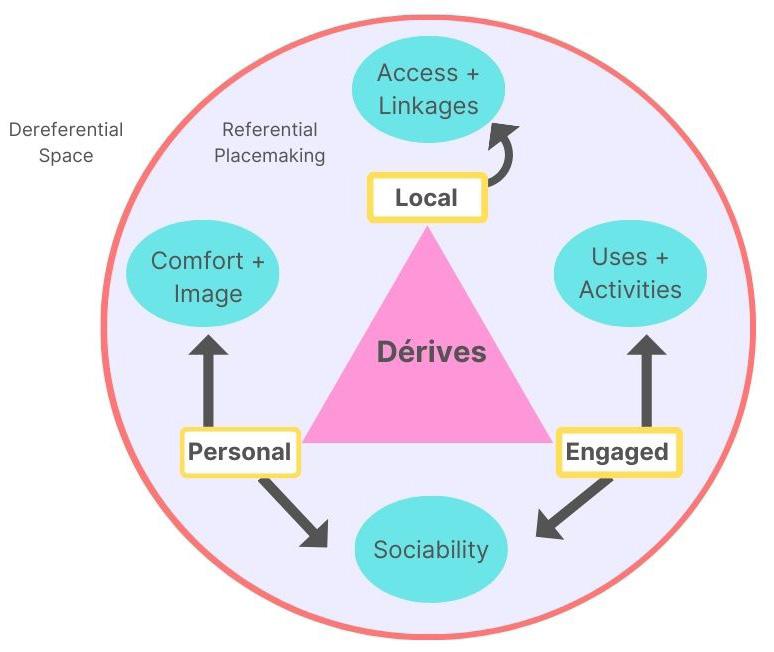 In “Placemaking As Referential Engagement,” Corey Bray and Samantha Pace argue that placemaking is local, engaged, and personal. They informed their notion of placemaking by the Project for Public Space and their Place Diagram, developed an application of this framework with Guy Debord’s psychogeography and theory of the dérive, and incorporated Jean Baudrillard’s orders of value. Their descriptions of intentional wanderings, hiking to a glacier or meandering through a town, make their article tangiable and personal.