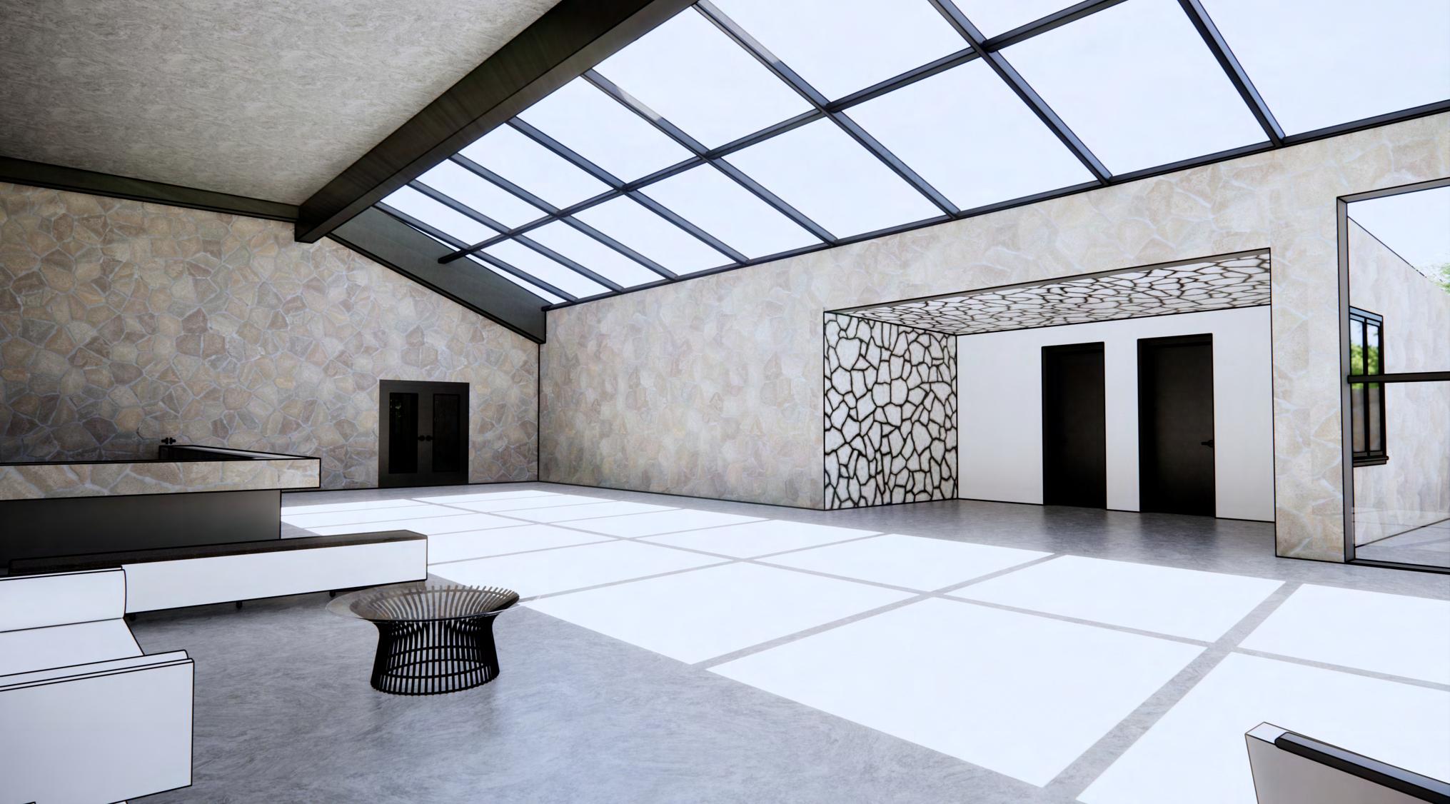 Interior View, reception. This inviting space features a partially glass roof that allows the sun to pour in, warming the room and creating a bright, uplifting atmosphere.