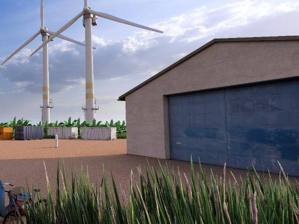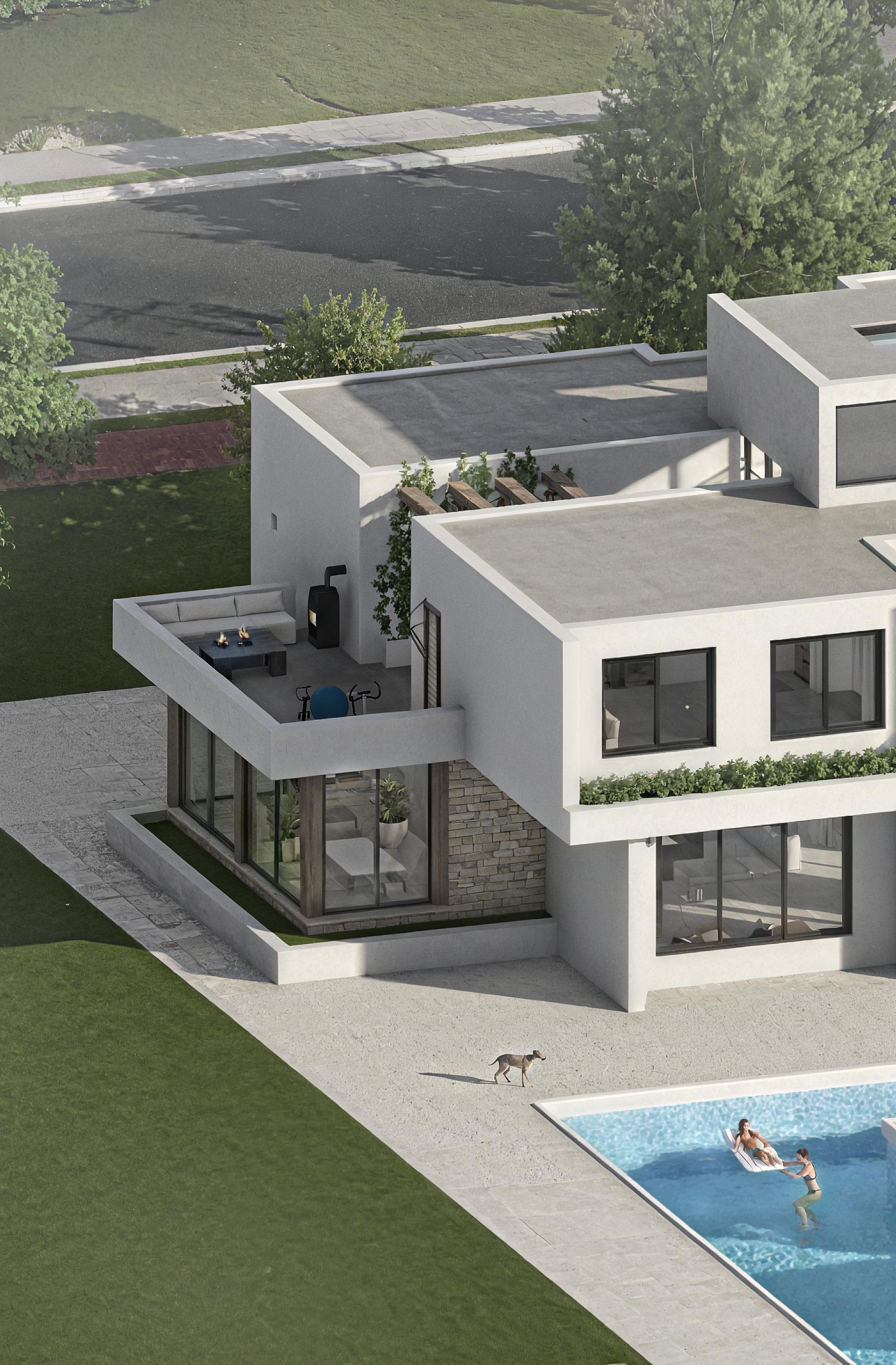 South Exterior View. As requested by the clients, this outdoor area is designed to accommodate gym equipment, providing a dedicated space for exercise, as well as generous areas for rest and social interaction.