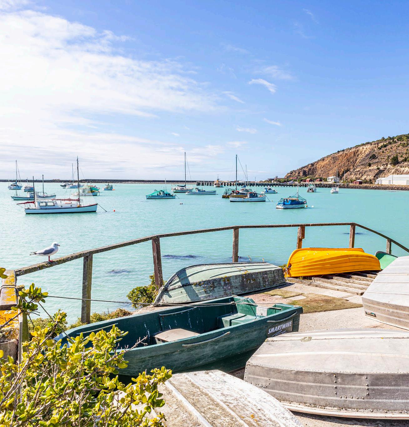 boats floating in the turquoise seaside. Lookout for little penguins and fur seals near Cape Wanbrow, and stop off at Sumpter Wharf to spot the shags. Cape Wanbrow also offers walks and bike tracks around the ancient volcano. Don’t miss the historic Defence Watchhouse, coastal pillow lava and sunrises from Lookout Point.