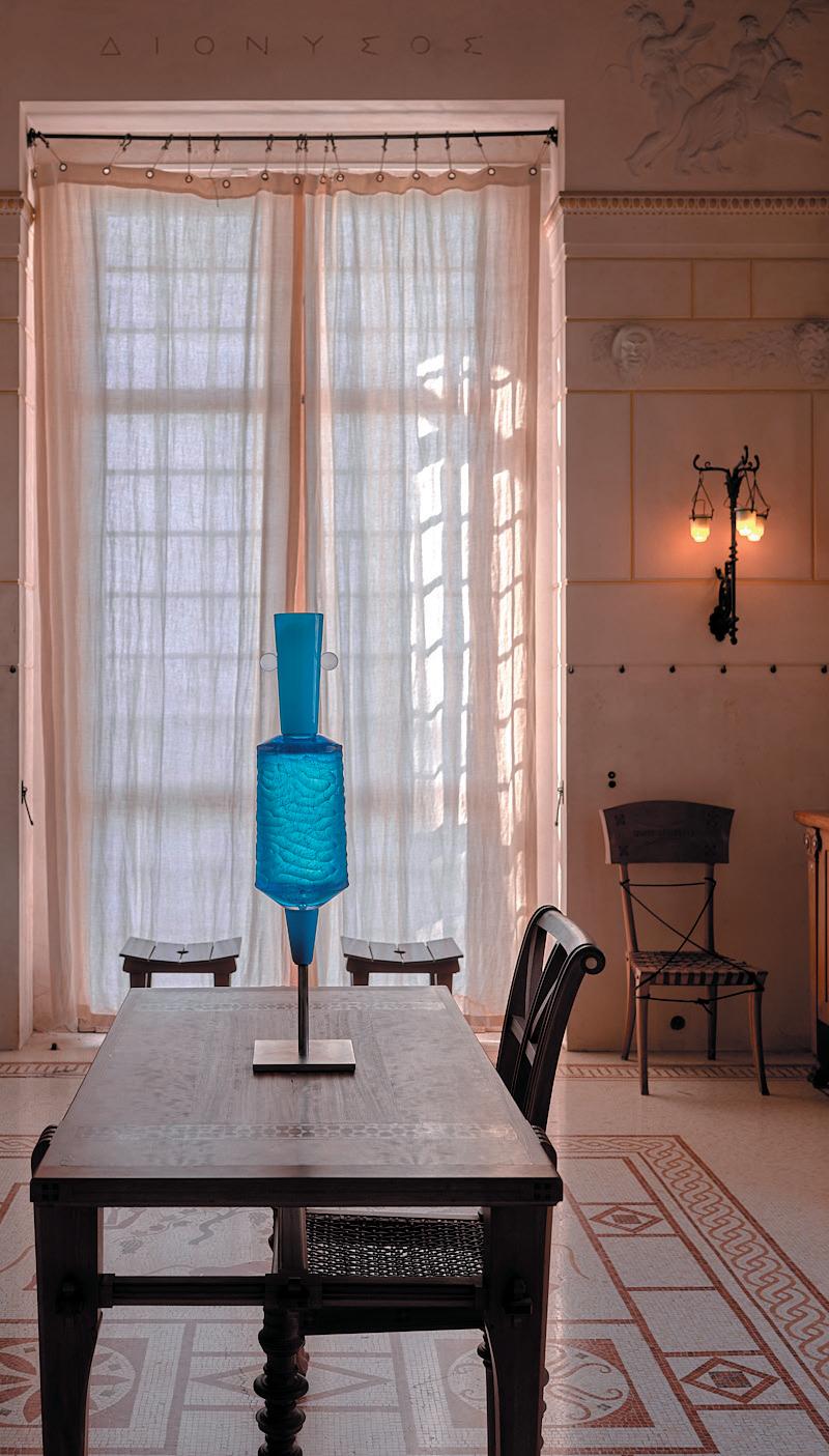 Today’s artists are regularly invited to show their work in monuments, capturing the spirit of the surroundings while also enabling creative freedom. The result is a virtuous circle. In these strange and volatile times, monuments more than ever reflect an unbroken bond with the land and people’s attachment to these places. Temporarily exhibiting contemporary works amid historical collections helps cast our legacy in a new light, encouraging visitors to discover and rediscover these places. The approach is now well established and has gained a real following. National monuments effectively promote culture and breathe new life into regions while raising broad awareness of art and culture. Villa Kérylos is a wonderful showcase and is the perfect setting for the glass art of Antoine Pierini, an artist, designer and master glassmaker from Biot. His pieces reflect the bright Mediterranean sunshine; their shape conjures the memory of antiquity. In these surroundings, amphoras—antique vessels previously valued only for their contents— are transformed into works of art that attract the light. Unburdened of wine and oil, they resemble Cycladic figurines, guiding visitors towards Théodore Reinach’s vision of halcyon Greece. True to Villa Kérylos tradition, Pierini neither copies nor replicates antiquity: he uses its language to inspire his art, replete with references and evocations.