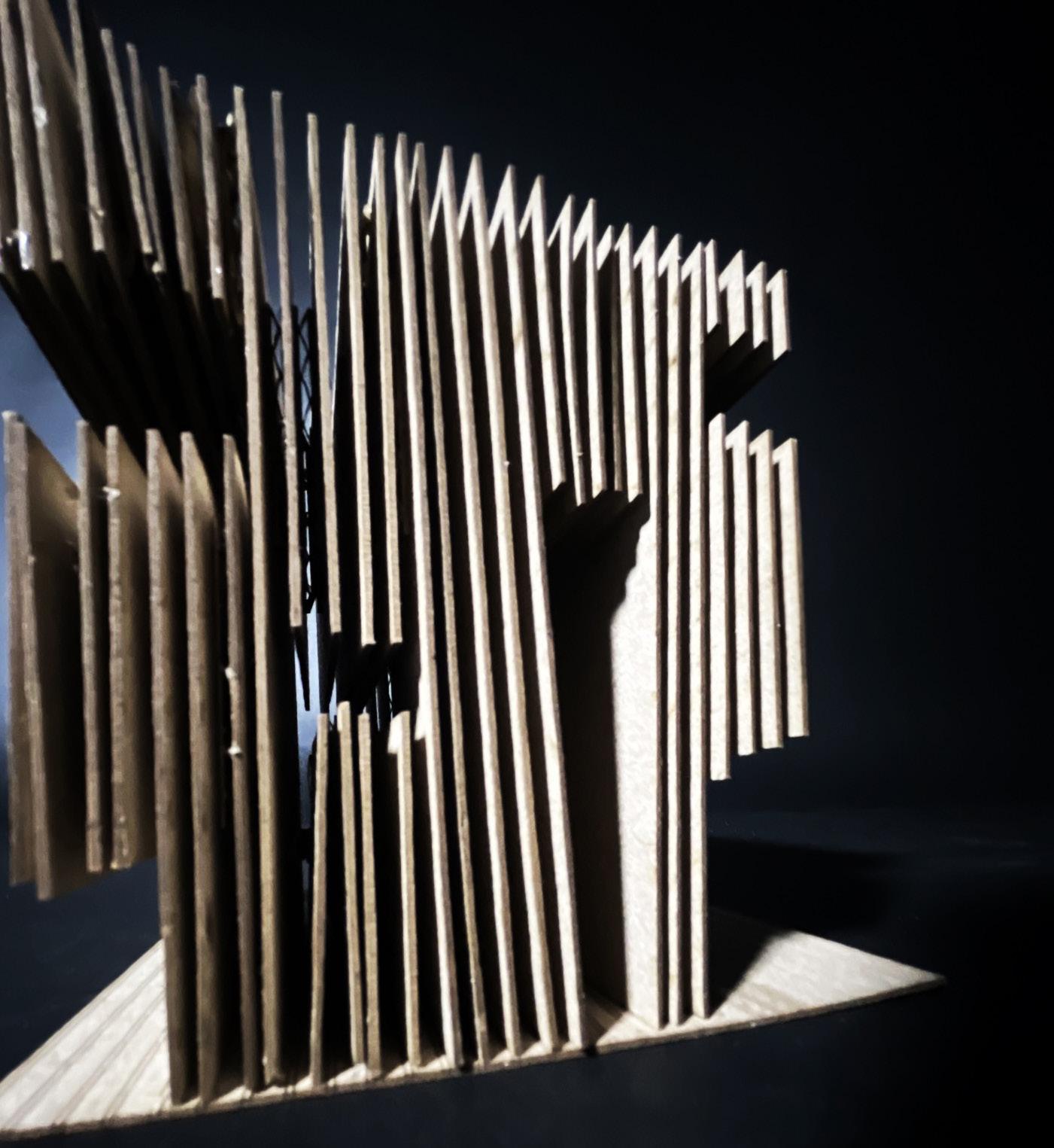 The study model experiment with solid/void conditions through vertical layering, creating an interplay between enclosed and open spaces.