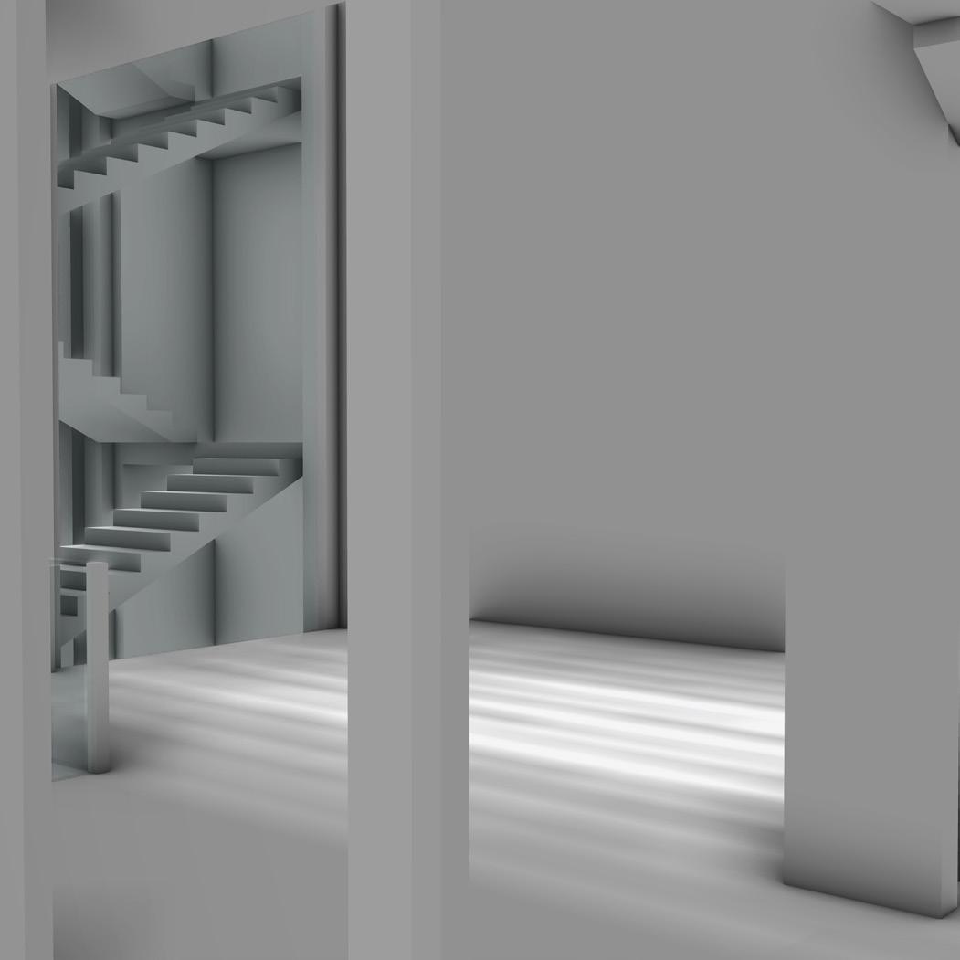 The view of the fire stair from the sixth floor triple-height space highlighting its vertical design. By exposing the circulation on the steps through the glass and hiding platforms by the thick concrete emphsizes the solid/void condition seen throughout.