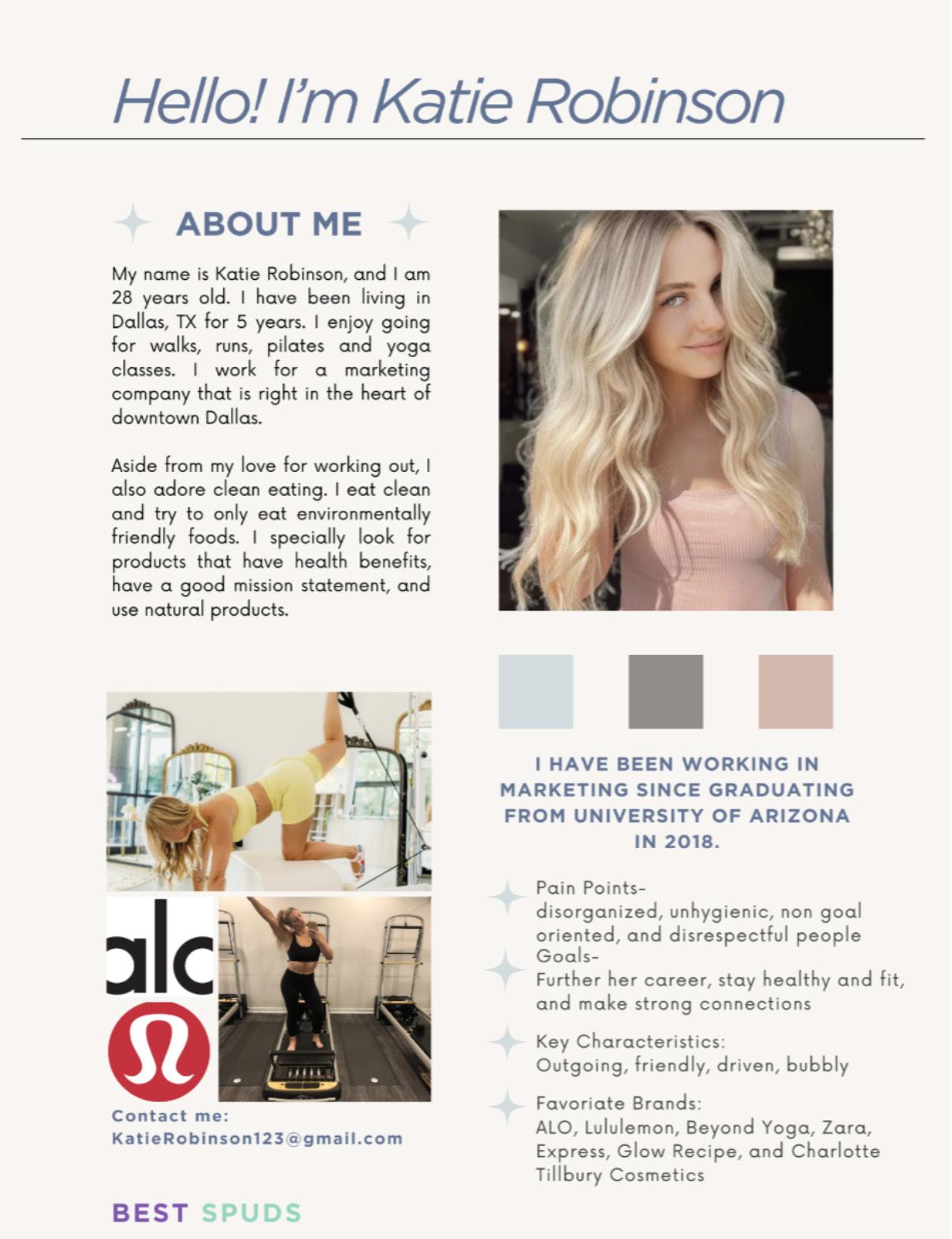 Paige Farmer is a 30 year-old woman living in Chicago. She lives with her husband Drew whom she recently married. They live in a two-room apartment in Lincoln Park. She enjoys fitness and has recently gotten into hot yoga. Her 2024 resolution includes taking more yoga classes and making sure to walk on a daily basis. Whether it be outside or on the treadmill. Paige and her husband also stay active through a local kickball league in the city. Not only does this allow them to socialize with friends but it keeps them active at the same time. Paige has recently gotten into clean eating. She decided to go glutenfree after struggling with stomach issues for the past five years. Implementing glutenfree options has been an adjustment for both her and Drew. A typical day in Paige’s life includes starting her day at hot yoga, taking a quick shower, and heading into her office at the marketing firm where she’s been employed for the past six years. Paige ends her day cooking her new favorite gluten free dinner for her and Drew and finally winding down on the couch to watch their new favorite Netflix show.