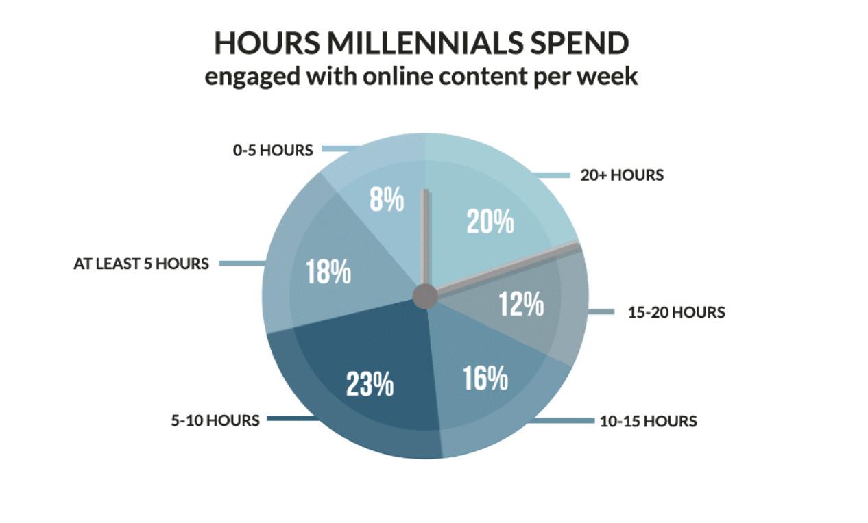 As the largest, most connected generation in the US, Millenial consume media across many platforms. Millenials are more likely to prefer social networks when researching brands online (Kepios). 70% of US survey respondents from Deliotte’s Digital Trends Survey say they follow an influencer on social media, with one-third stating that these online personalities influence their buying decisions — a figure that increases to more than half for US millennials. According to a report conducted by GWI, the daily time spent online by Millennials has been on a steady decline from a peak of 7 hours and 36 minutes in 2017, with the average sitting at 6 hours and 48 minutes as of 2023.