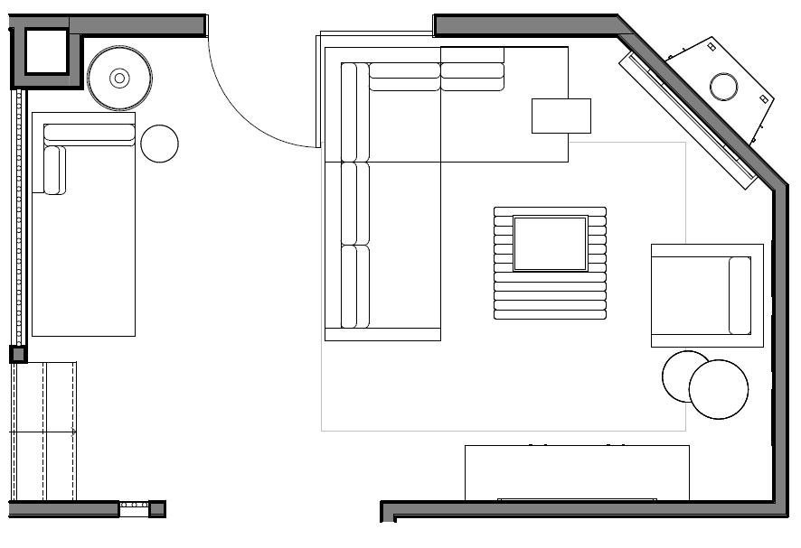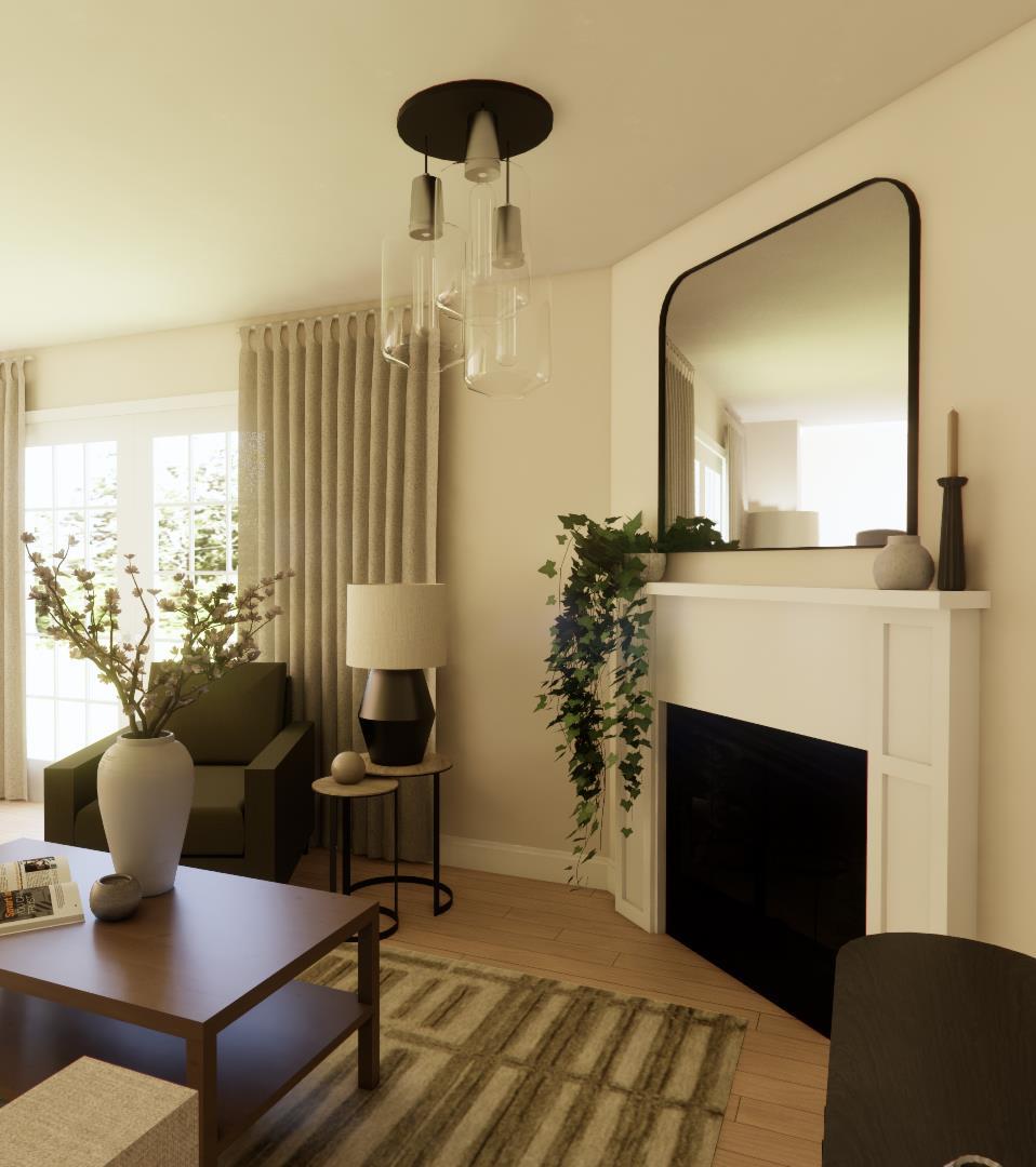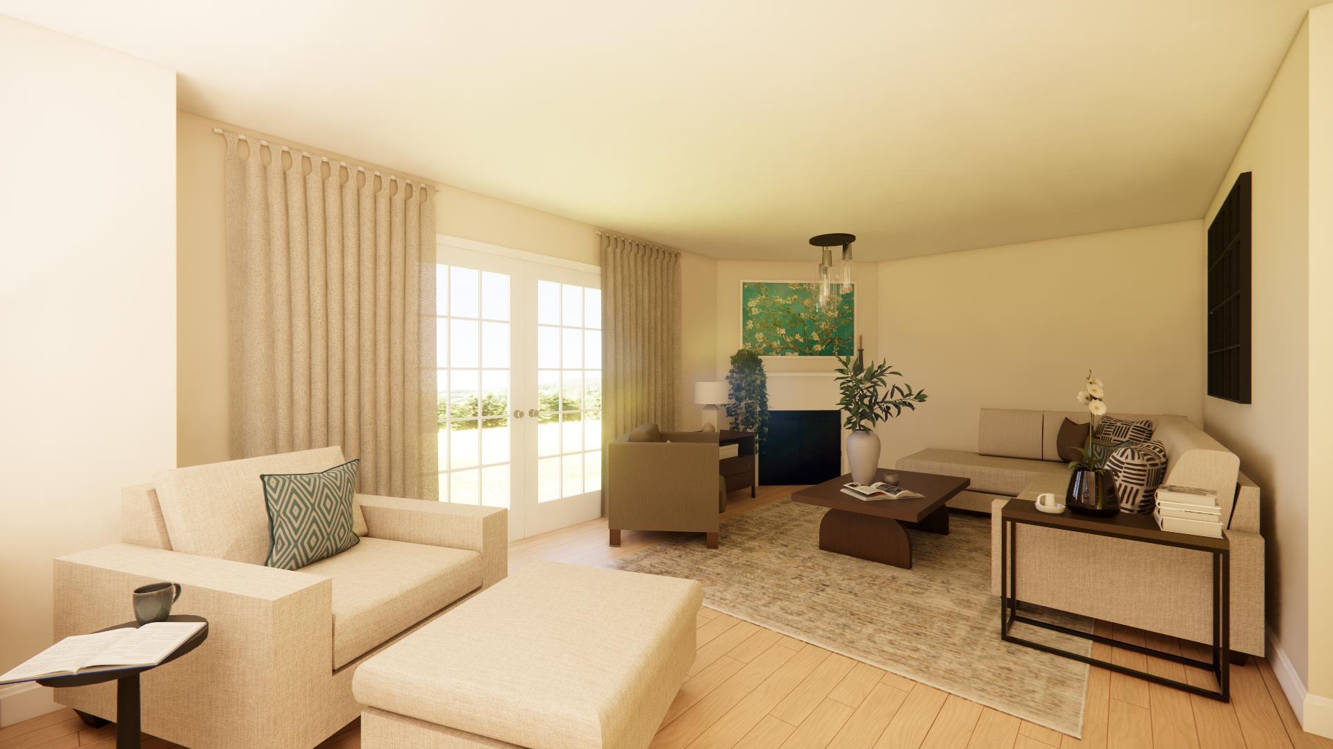 The clients sought to prioritize comfort in their newly renovated family room This first iteration uses furniture to designate a media room separate from a cozy reading nook. Keeping consistent with the newly renovated kitchen, This transitional space feels cozy yet fresh.