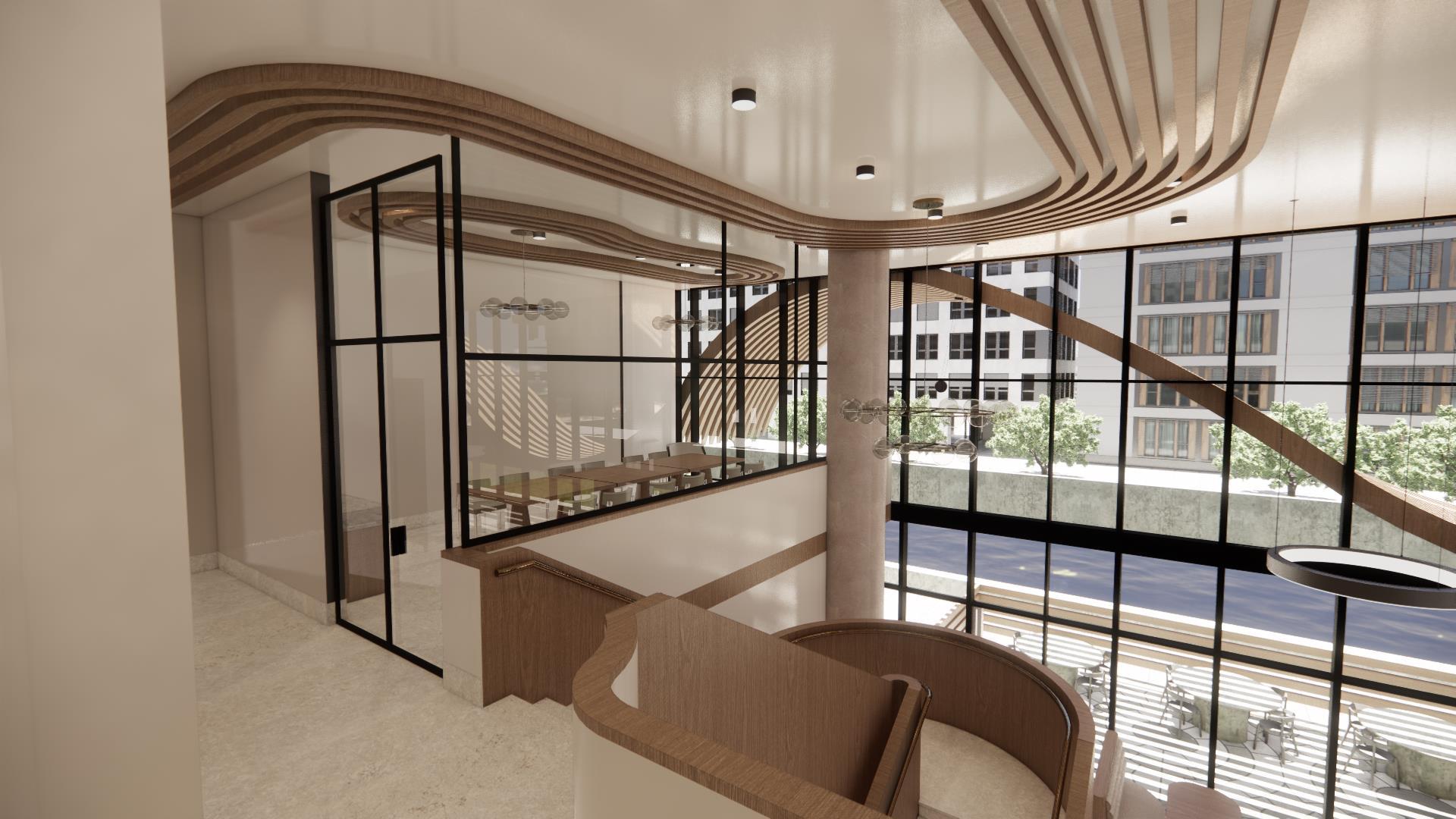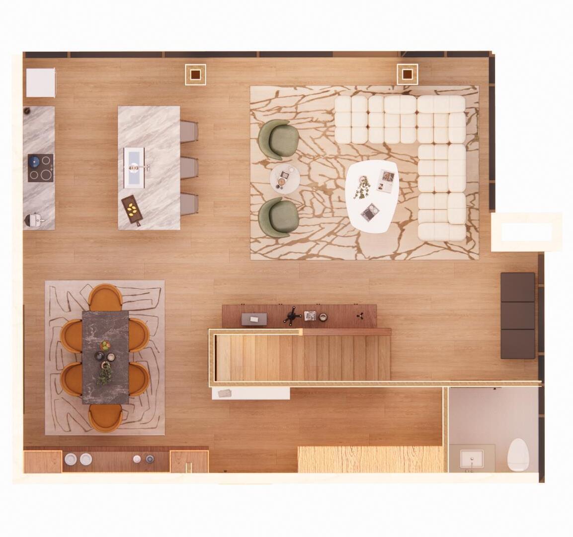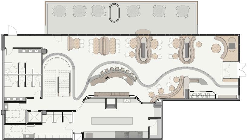 The floor plan takes on the form of the shoreline itself. From the custom millwork to the curvature of the walls, the interior mimics the organic movement. Lining the floor and ceiling are custom wood features to accentuate this form.