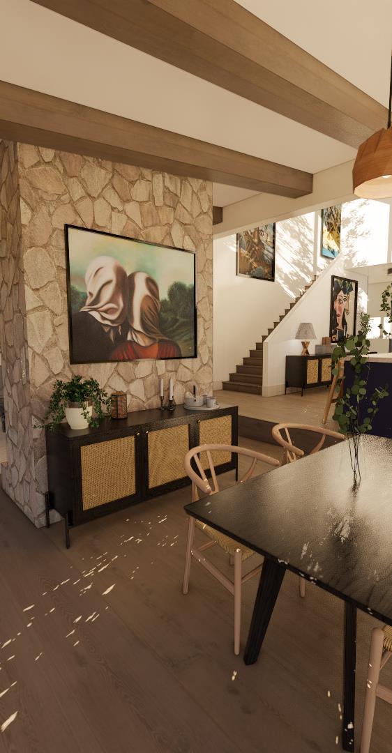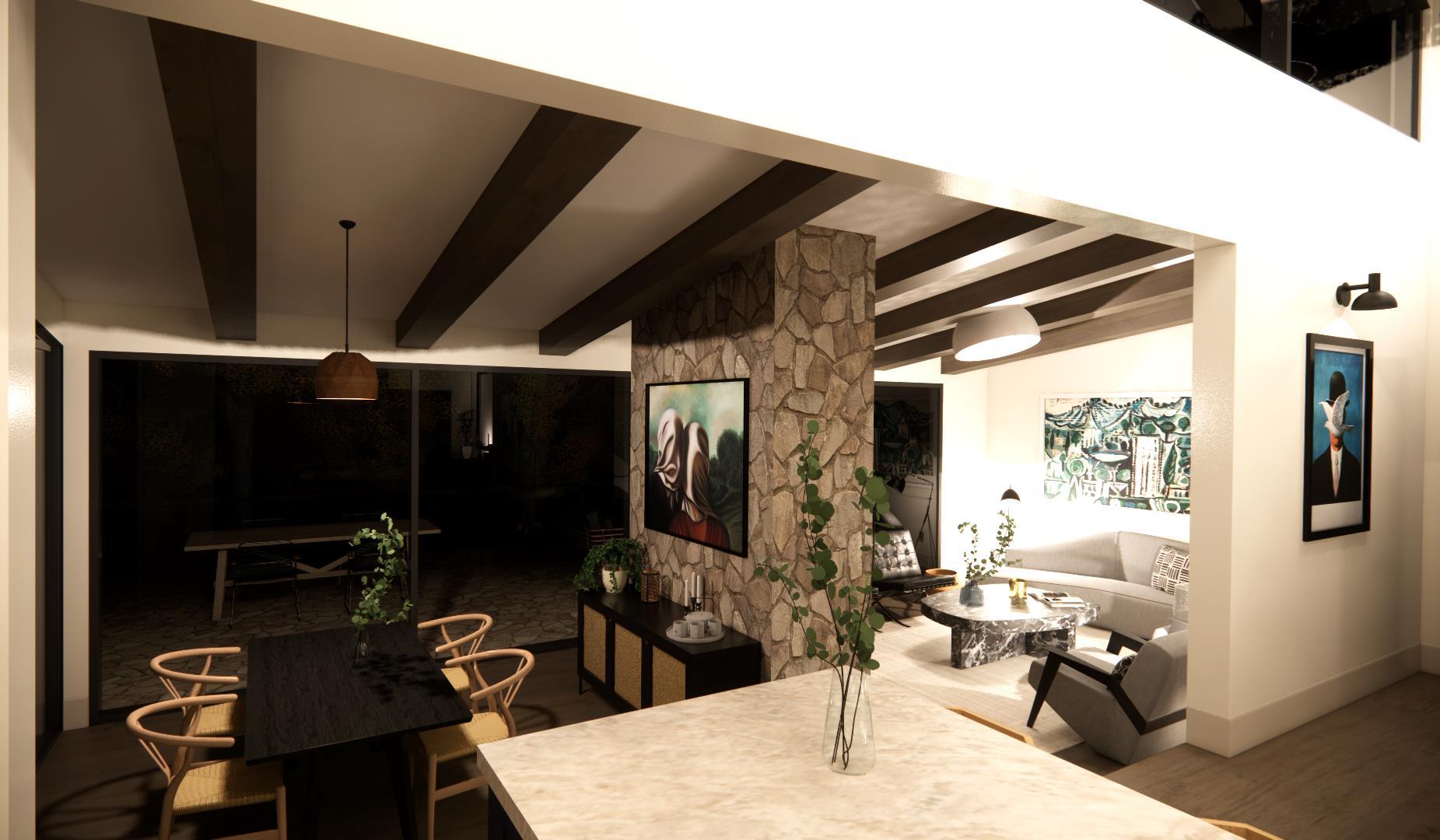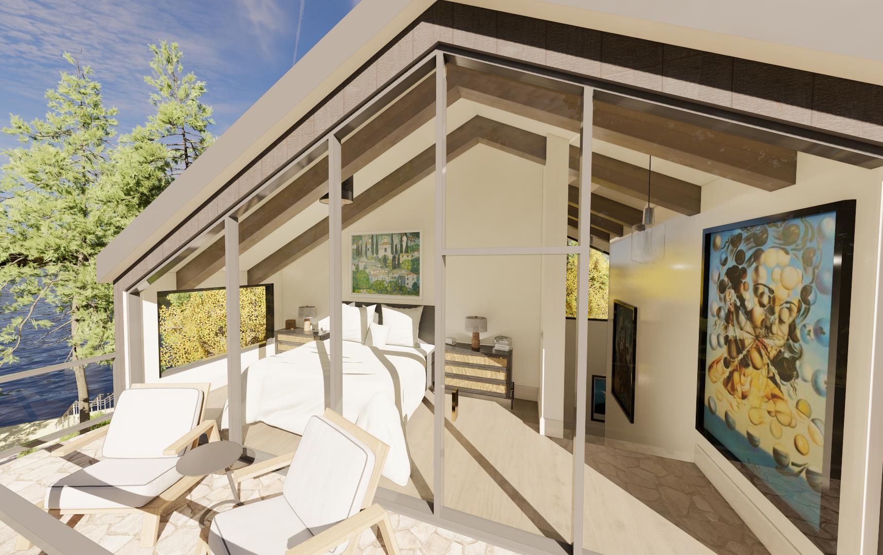 While this cottage seeks inspiration from the natural landscape that surrounds it, it is contrasted by pockets of the client’s urban origin Contemporary art and furniture perfectly contrast yet enhance the structure. Furthermore, large contemporary windows allow the clients to feel one with nature, allowing optimal views of the lake from within their cottage