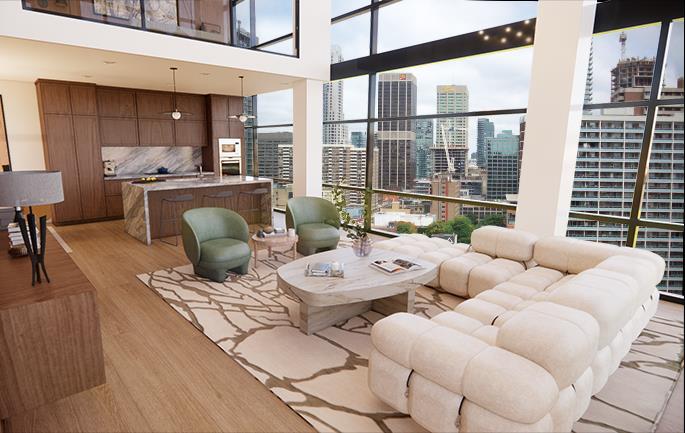 A historic building in the heart of downtown Toronto, this converted Tip Top Tailors factory holds much industrial charm Streamlining the architecture allowed this cilent to display their belonging as a work of art. The cohesive use of material throughout connects the rooms visible from nearly every corner of the space.