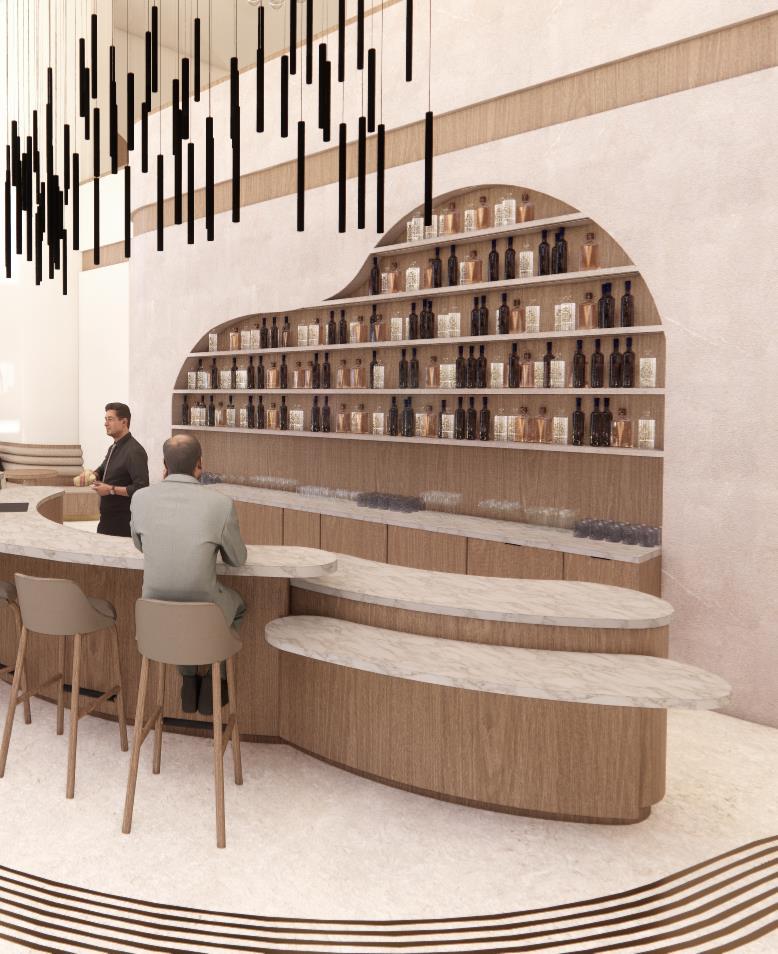 The exterior of Alter is simple yet sophisticated. Positioned along the Yara River, the patio is covered with a custom wood feature, to mimic the form of the Great Ocean Road Coastline.