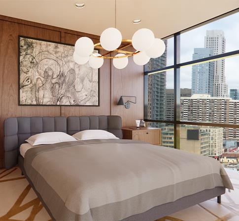 Using custom walnut millwork throughout the loft elevates this luxurious space. The neutral tones of the wood pair well with the bold array of art pieces. The pops of colour in the seating throughout tie the colourful artwork and the neutral architectural features together.