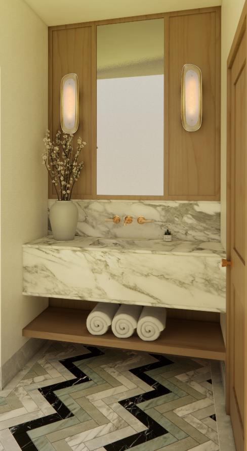 This contemporary bathroom merges an array of rich marbles with warm wood, to create a serene powder room Inspired by Japanese Wabi-Sabi, its subtle elegance is sure to last the test of time.