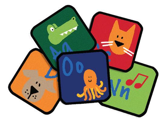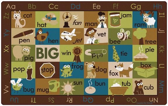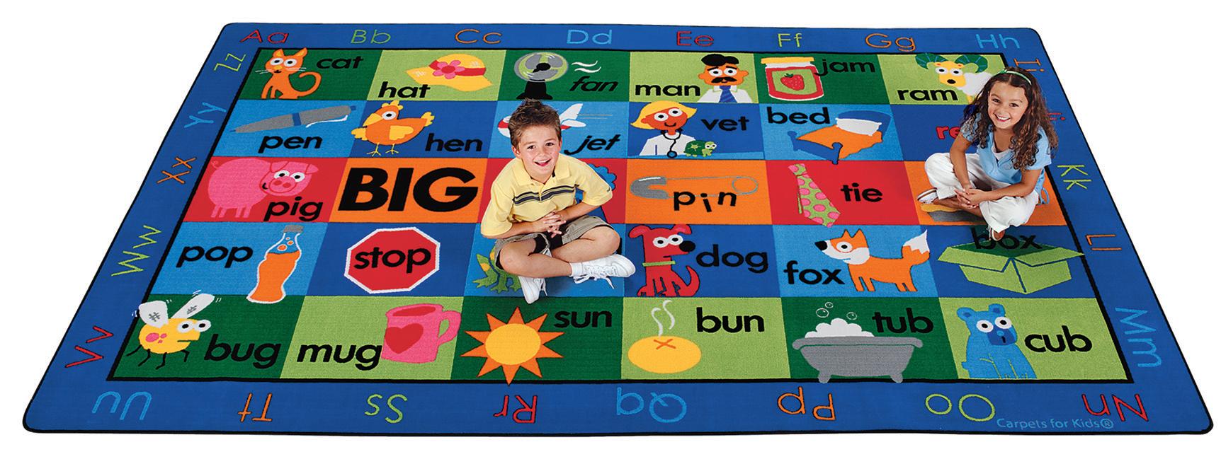 Hat:Cat, Fan:Man, Jam:Ram. This seating rug has fun and silly icons that rhyme from left to right. Each row features a different vowel from the alphabet. Thirty spaces in total provide enough room for each child to sit comfortably, and an alphabet border throws in an extra element of literacy!