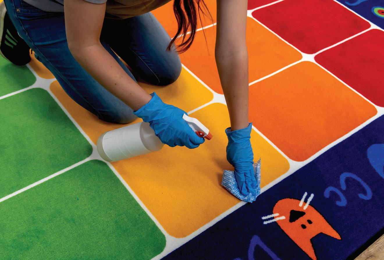 Mist your rug with up tp 70% Isopropyl Alcohol Spray (ISP) following CDC recommendations for cleaning soft surfaces in the classroom.