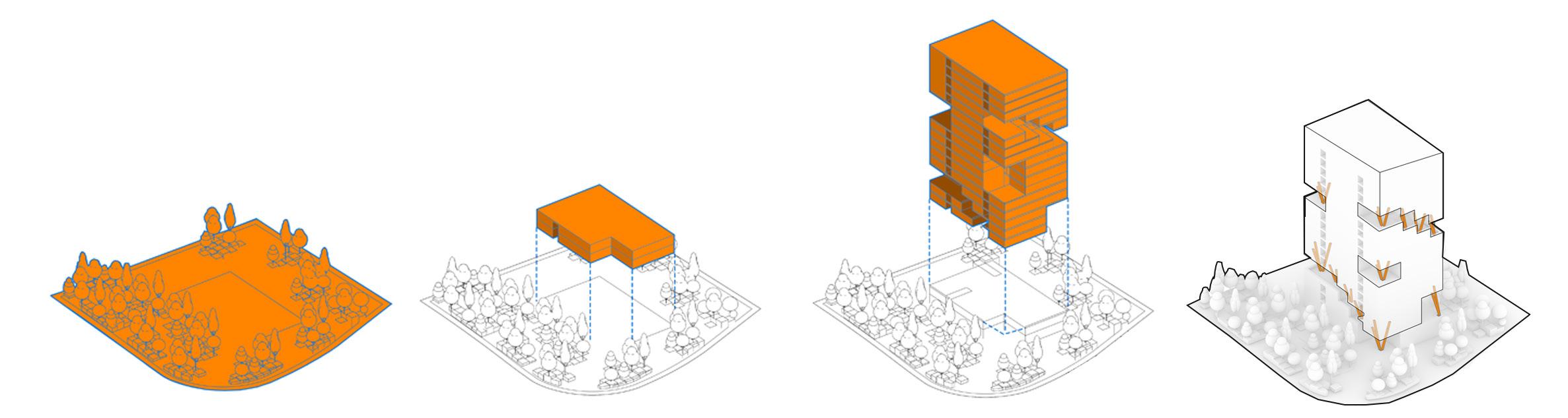 The diagrams show the evolution of Silva Tower informed by climate analysis, optimizing volumetric extractions and site balance to enhance natural ventilation, shading, and energy efficiency, while integrating programs like public parks and housing to create a context-sensitive urban living environment.