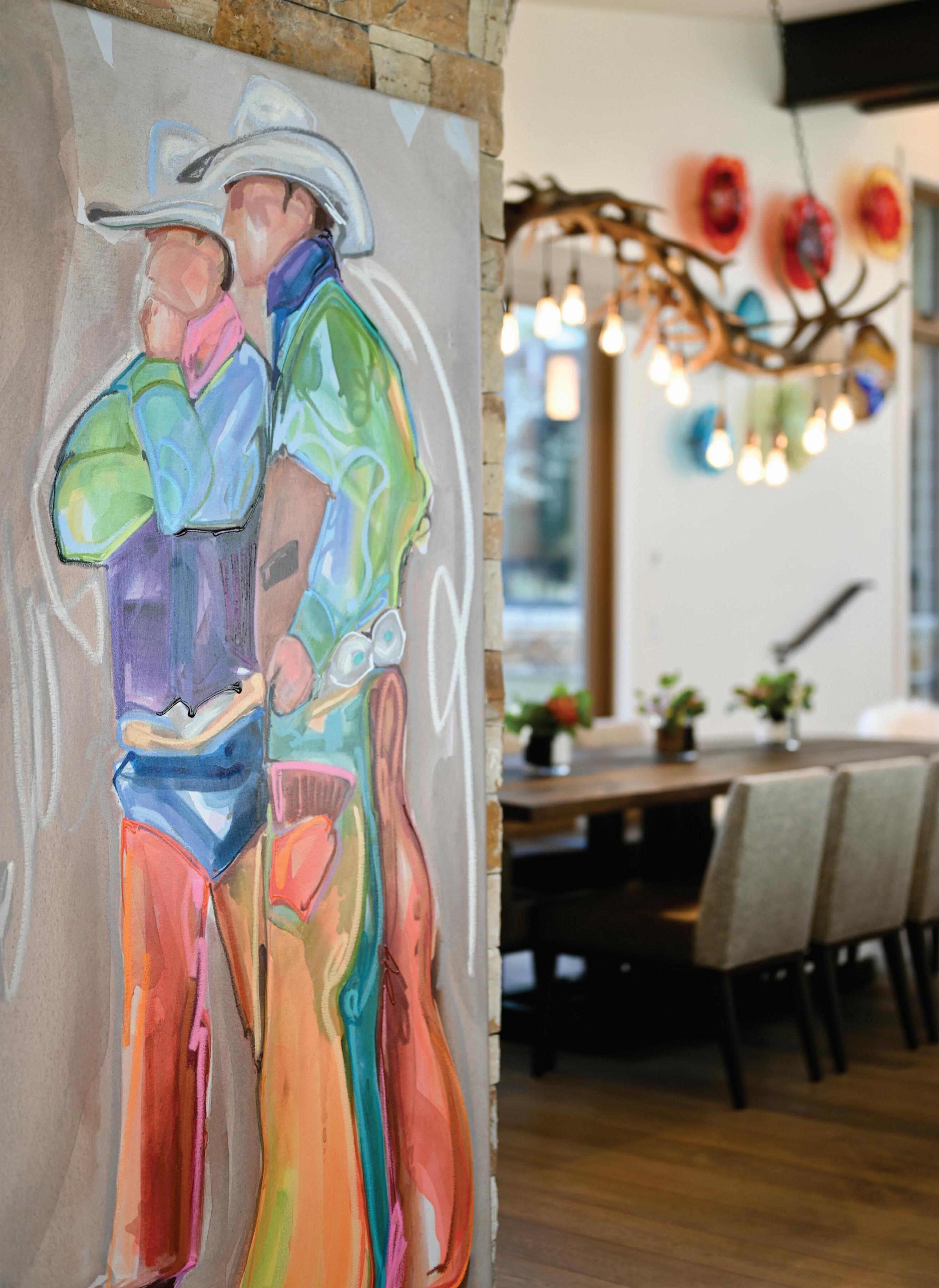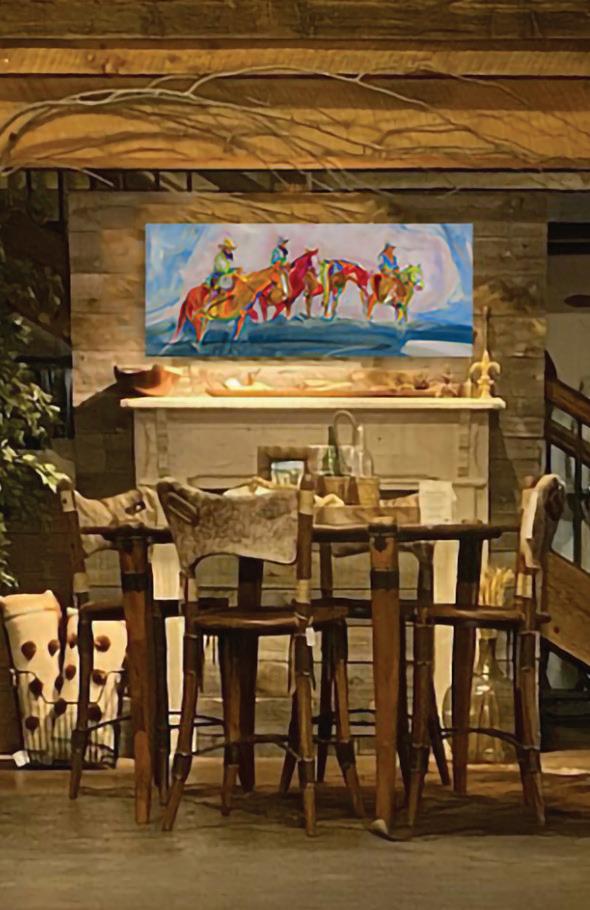 “My Dad has a big art collection and Carrie’s piece is the biggest one in his collection,” explained Jen. “Seeing those pieces still takes us back to early days of marriage when we couldn’t afford “real art” … we could only look at her work and dream of when we might be able to buy one ourselves,” added Dan. But, Jen and Dan knew they would collect Carrie’s art, themselves, one day – “it’s the contemporary portrayal of the West that drew us in. Carrie’s ‘new West’ speaks to us more than an ‘old West’ style… The bold colors express an energy… you can feel the motion; you can transport yourself into the scene. Carrie’s work feels so fluid, and there’s a sense of freedom – even her signature!”
