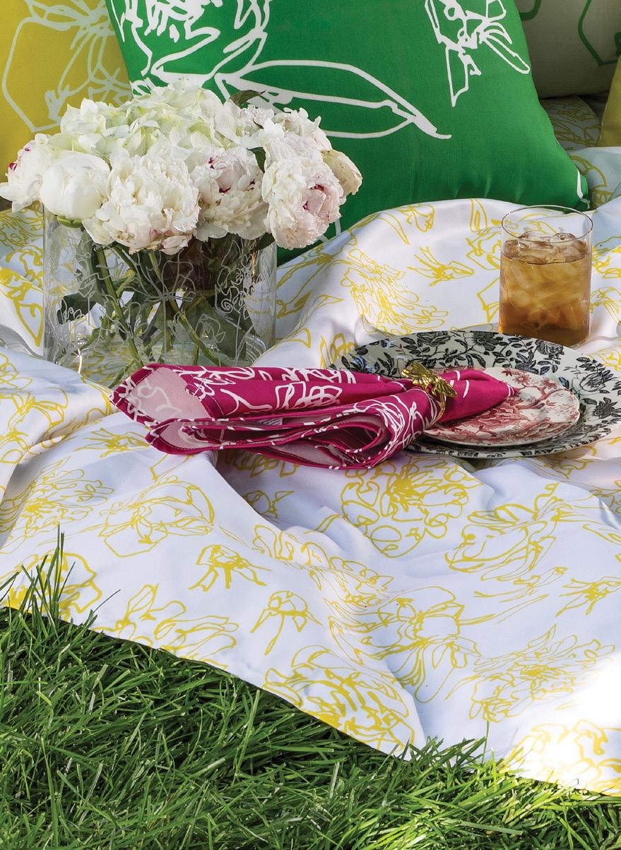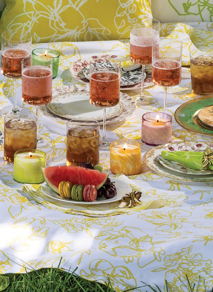 Collectively, the ladies of ARTful style LOVE any opportunity to gather! (The recap of our Gallery at 2175 industry event on Pg. 14 says just that!) However, we remind you that hosting an event need not be relegated to your dining room or require the finery stored until the holidays! Nothing brings people together or feels more indulgent than a meal served outdoors. Break out your best tableware and silver … most beautiful linens … add etched crystal stemware and glasses, and offer artfully crafted bits, bites, and sips, and suddenly you are lolling about in the sunny fields of Tuscany. In the “Summer Setting ARTful style” spread, we bring forth our vision laid with the “good China” and highlighted by cf + home’s newest collections: the stunning “Modern Peony” and “Cool Cowboys” patterns by Carrie Fell on custom-etched crystal and fine linen textiles. (P.S. A light Rosé champagne or wine really brings it all together!)