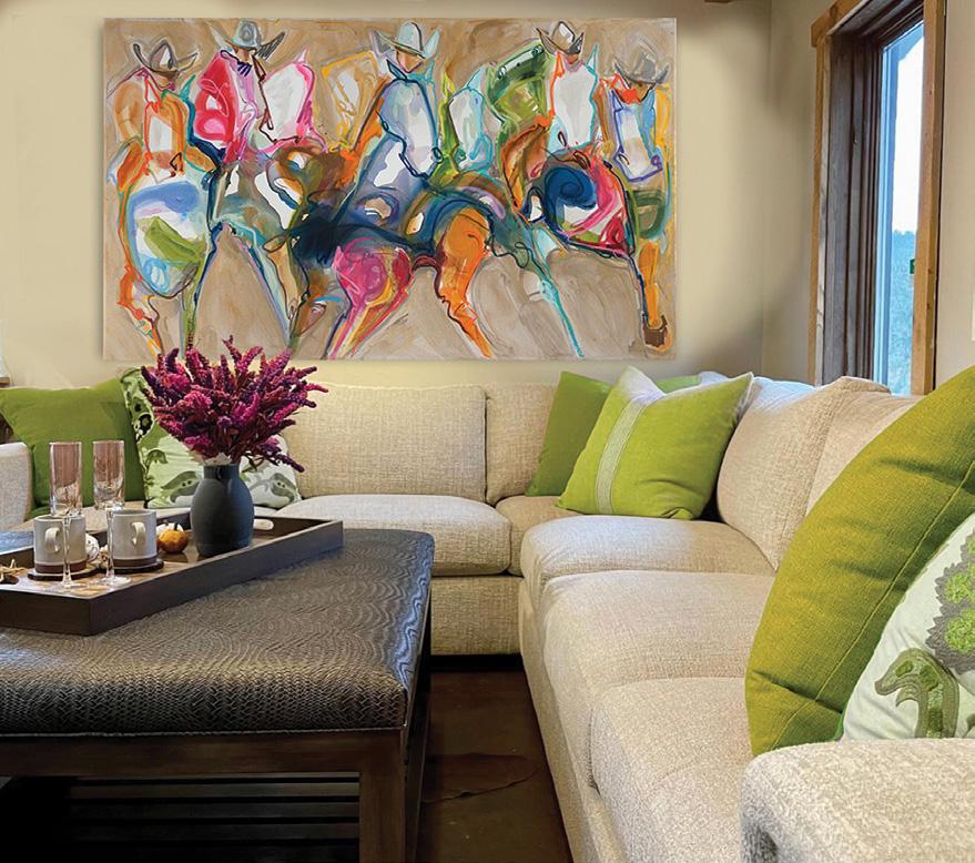 “We rented a home in Beaver Creek [around] 2000-2001 and went to an outdoor art festival and met Carrie there,” explained Tricia. “She was one of the featured artists, and as an artist, myself, I was completely drawn to her paintings. I loved her use of bright colors in the paintings and the looseness of her subjects... It was abstract yet real. I got my husband off the golf course so he could meet Carrie and buy that first painting! He fell in love with CARRIE, too, and the rest is history. We probably have 10-13 pieces in our (main) house, plus framed sketches from when we all traveled together, and a vibrant painting of a canoe at our lake home.”