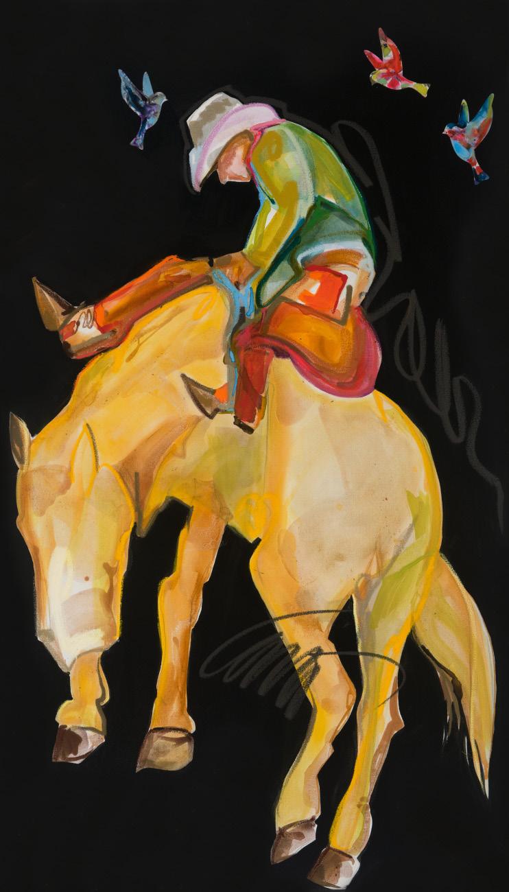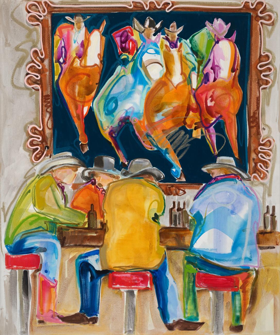 Carrie drew inspiration from her experiences as a Colorado native and Western influences for her iconic portrayals of cowboys, riders, and bar scenes. As her hometown of Denver has evolved, so have her subjects and the mediums through which she expresses these changes. Whether through the quintessential materials of the Old West, sophisticated abstracts of DESIGNLINE, the nostalgic mood of