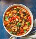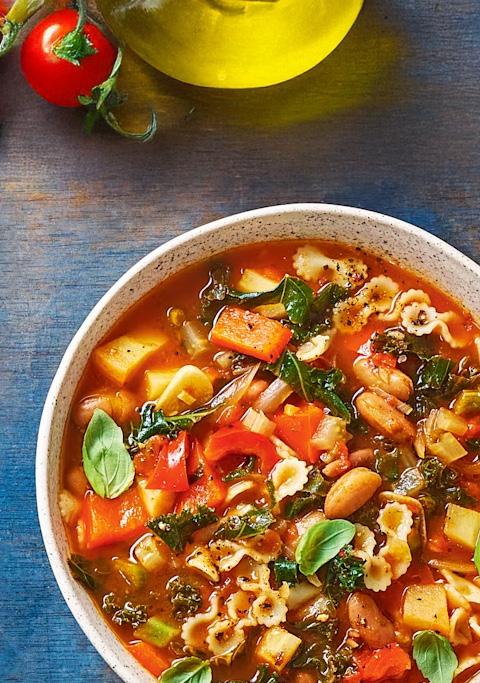 Heat the oil in a large saucepan, fry the pancetta, then add the onion, celery, carrot and courgette for 10minutes.