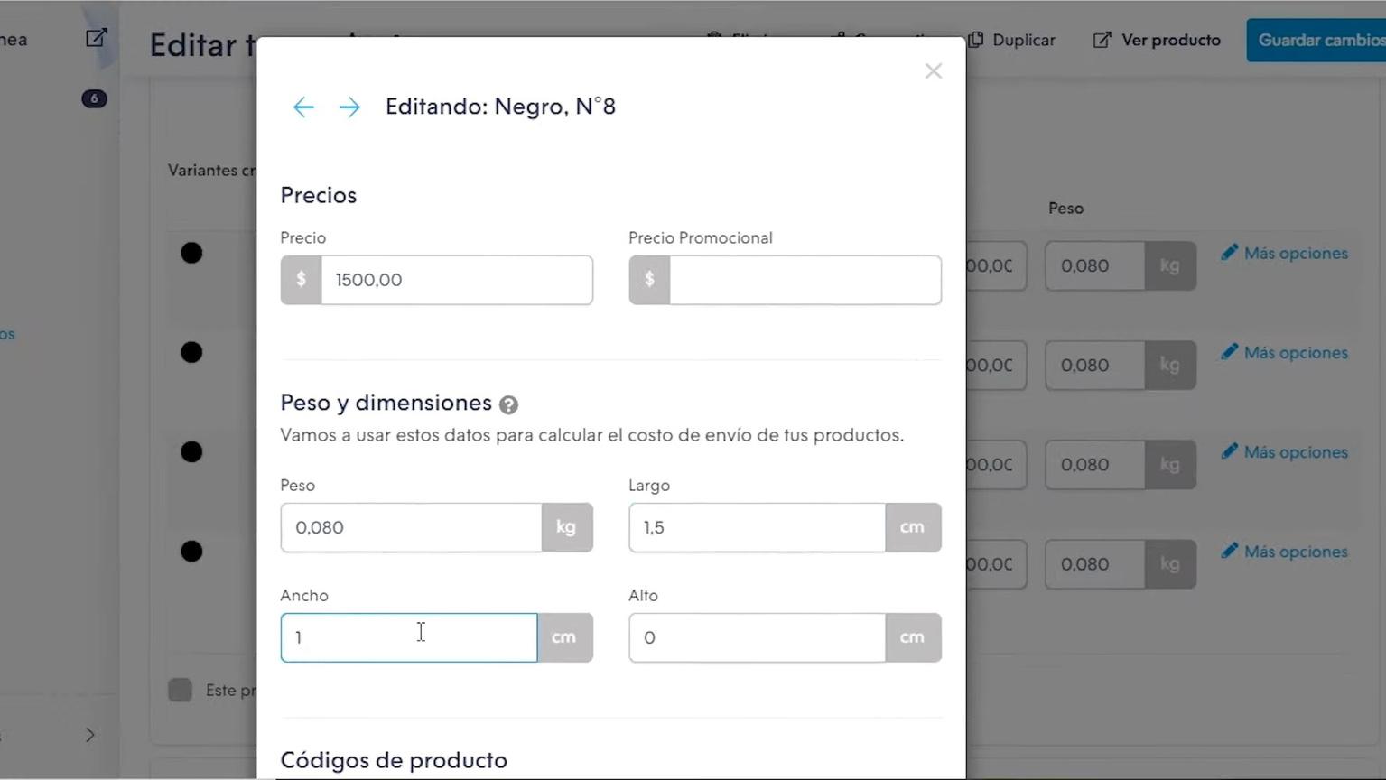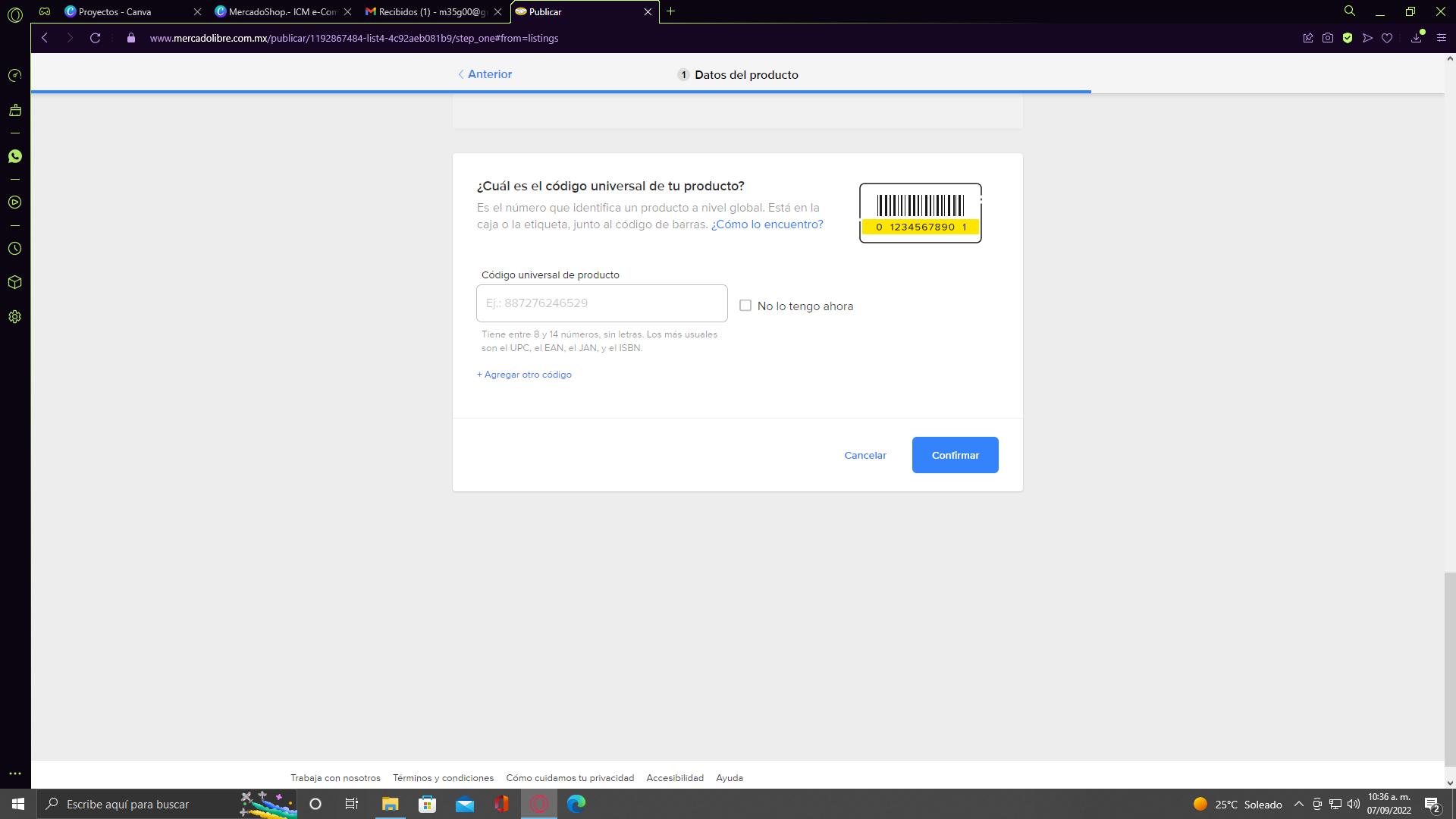 Ingresar el código universal del producto, o marcar que este no se tiene disponible.