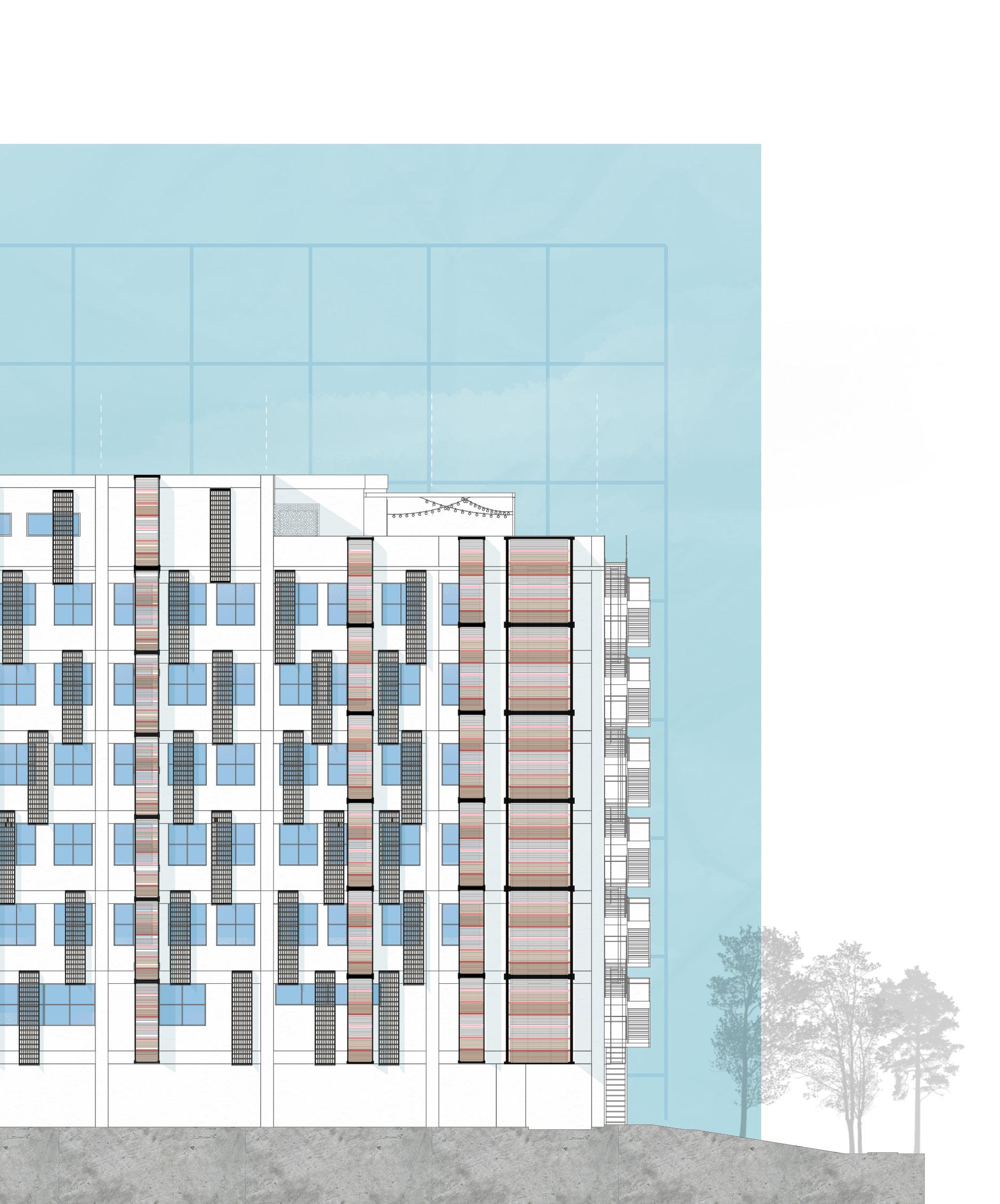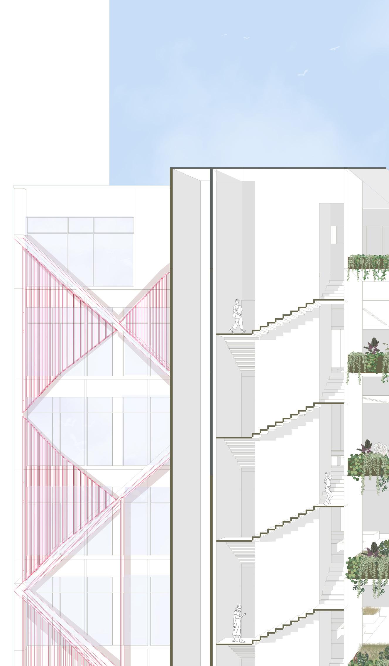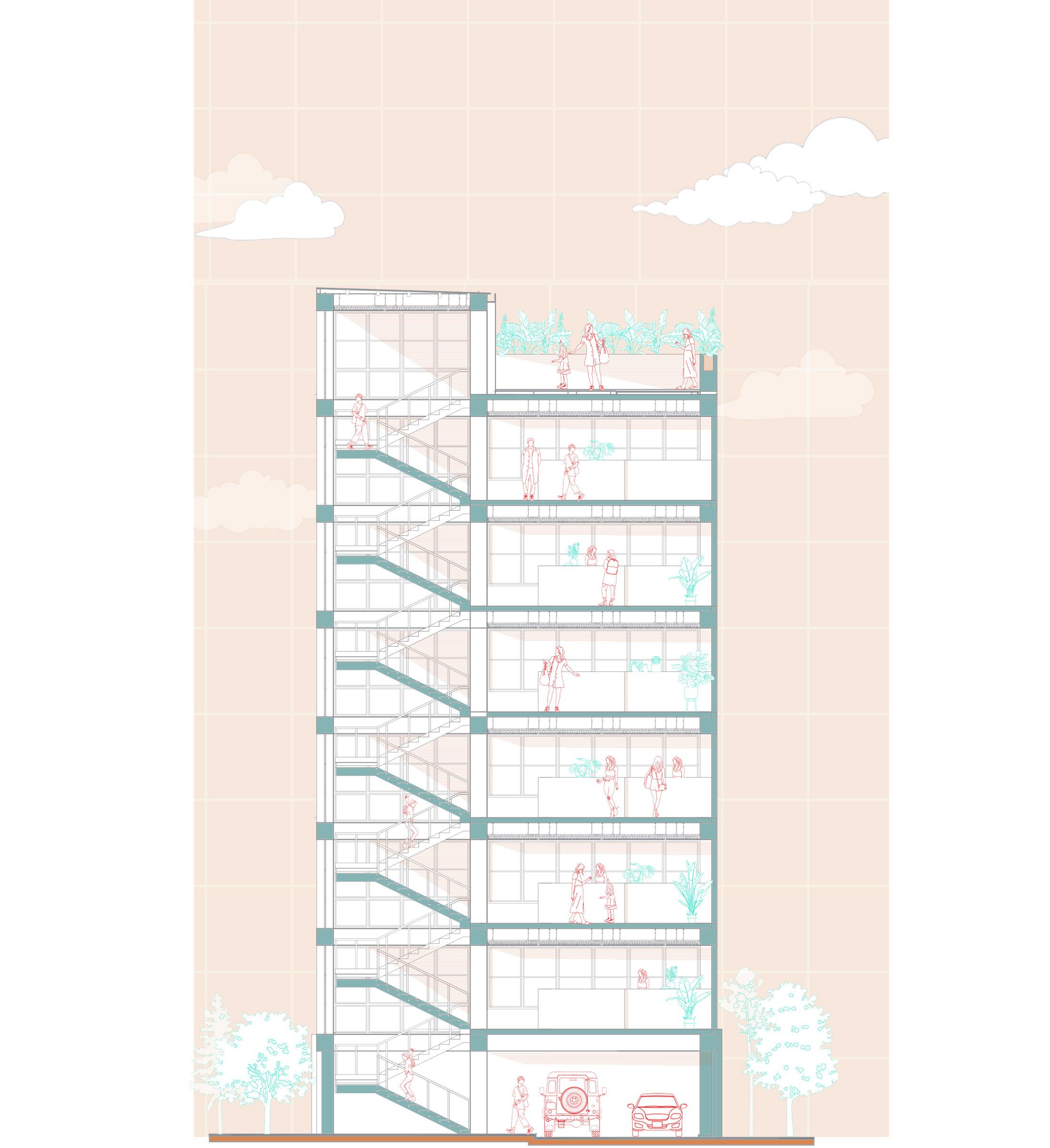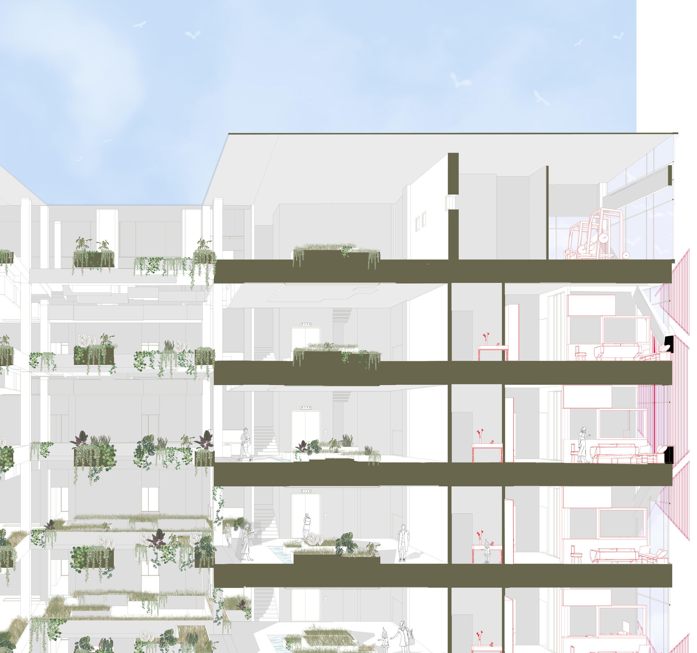 Partial section of the building to show the relationship between the apartments and the corridors with their vegetation.