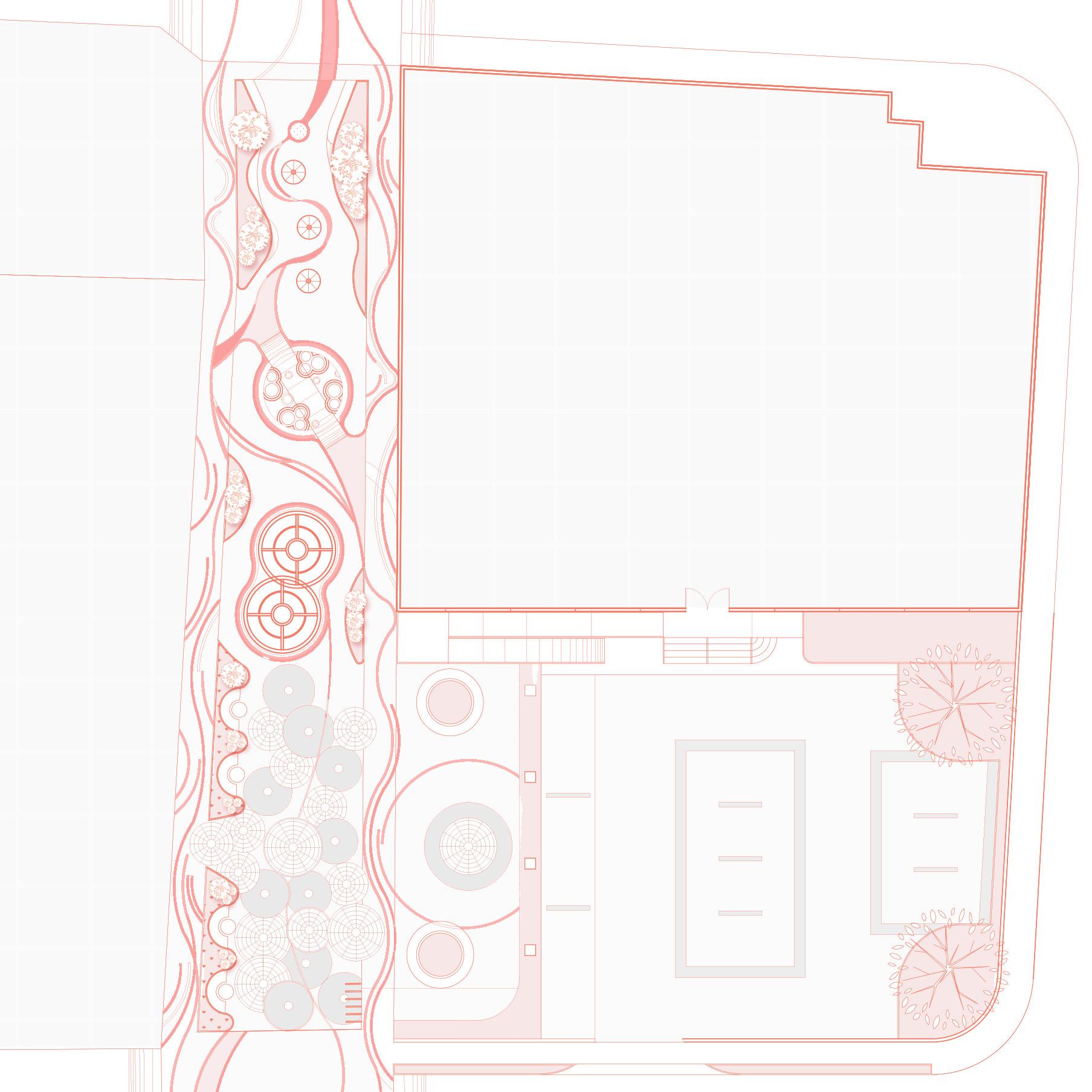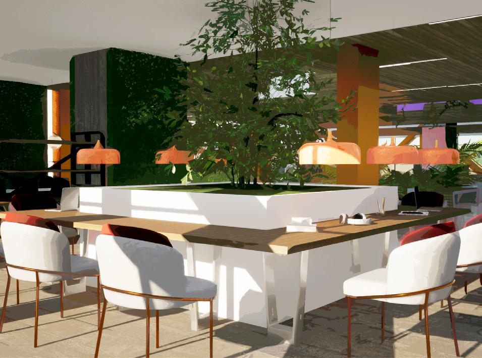 The layout throutout the entirity of the project has been carefully designed to create a welcoming environment, inviting all visitors to enjoy leisure, rest, and commercial spaces. The presence of vegetation is highlighted, by distributing them through high planter boxes and green areas that extend throughout the entire complex.